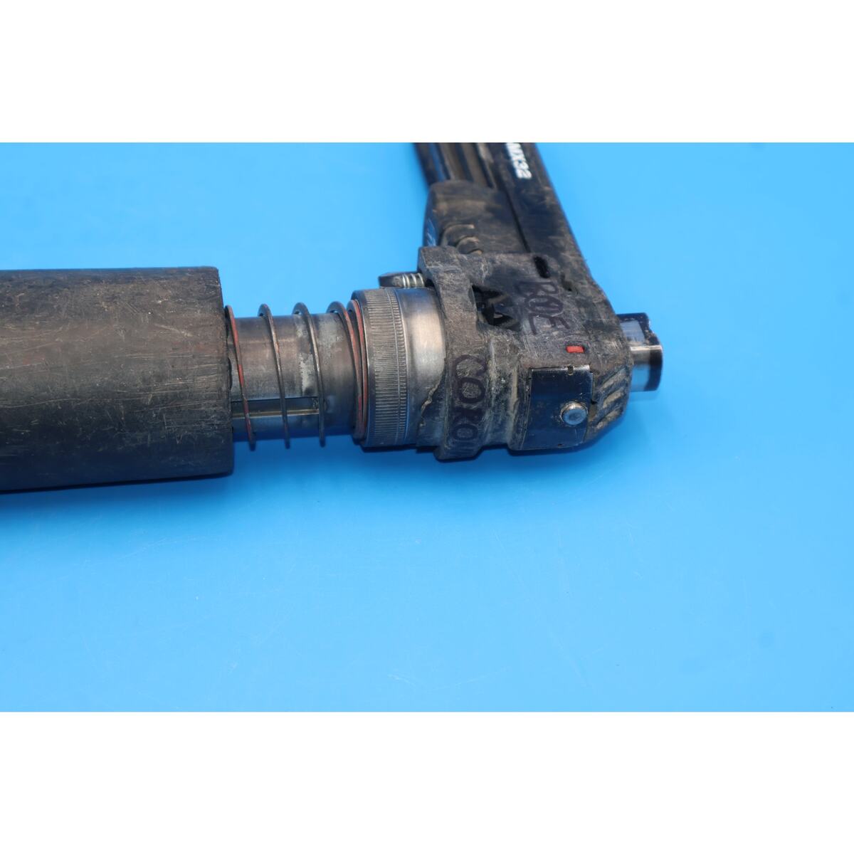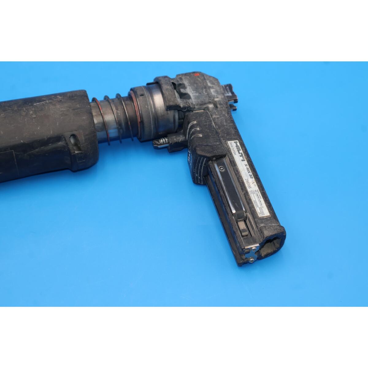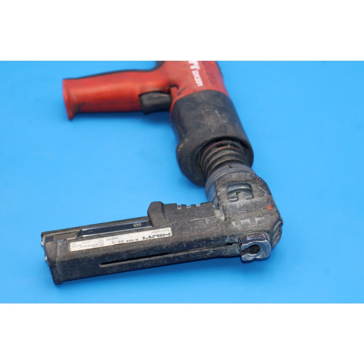 You are looking at a Hilti DX351 Powder Actuated Fastening Tool with X-MX32 Magazine. It is used and in fair condition, showing signs of normal use including scuffs, scratches, grime, and previous owner markings throughout the tool. The most noticeable blemishes are cosmetic only and do not affect functionality.