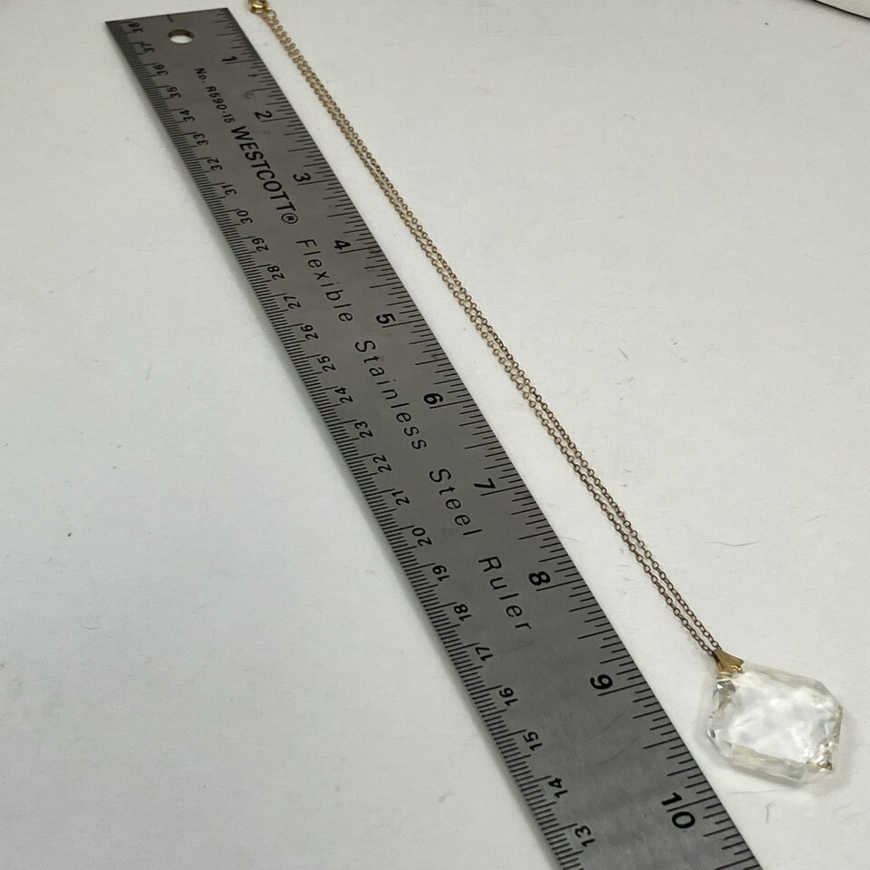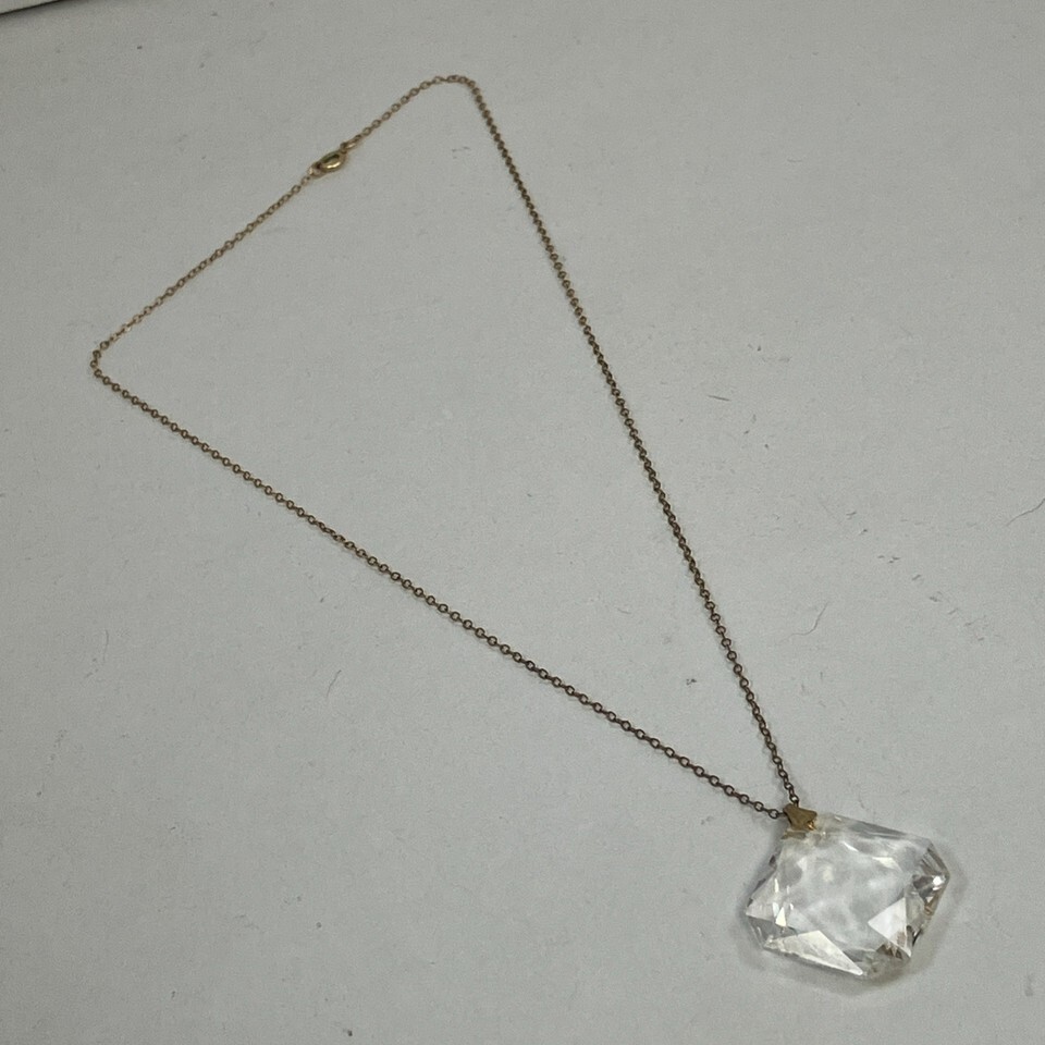 This Clear Cut Crystal 1? diamond shaped (square but angled) Pendant on a 12K Gold Filled 18? Necklace is a stunning piece of vintage and antique jewelry for women. The pendant features a natural white/colorless rock crystal quartz with a cut diamond shape, set in yellow gold filled metal. The necklace has a length of 18 inches, making it a versatile and elegant accessory for any outfit.