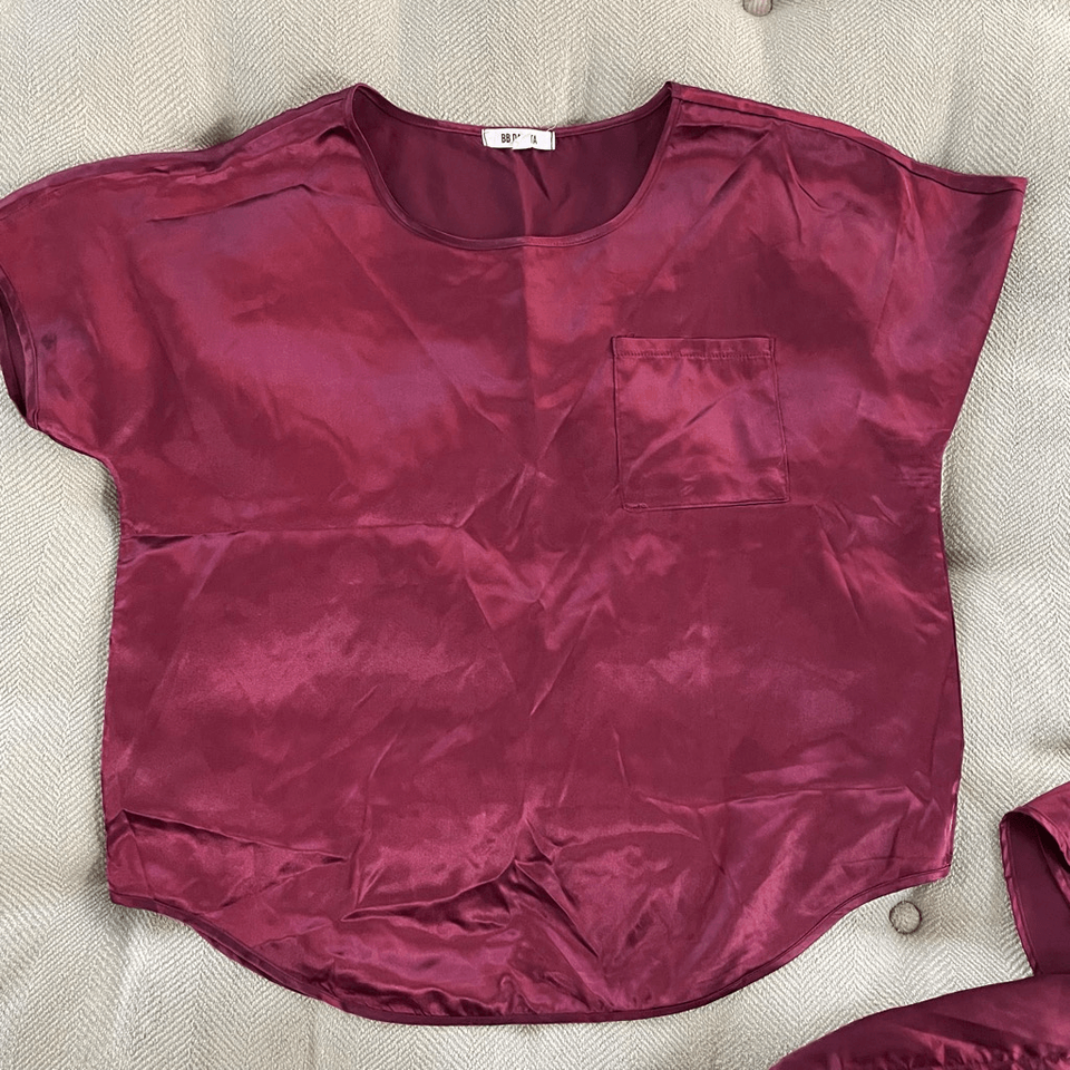 BB Dakota Women's Satin 2-Piece Short Sleeve Pant Lounge Set, tag, size medium. This ultra-luxurious 2-piece satin lounge set feels like heaven to the touch. A short-sleeve pocket tee and matching flyaway wrap pants are chic enough to hang out in all day and comfy enough to fall asleep in. Get ready for your comfiest night ever.