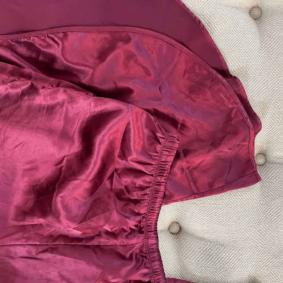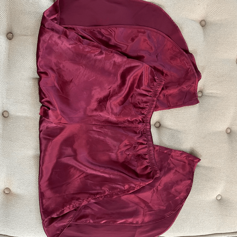Measurements are approximate and taken while laying flat: 24.5 inches shoulder to hem on the top and 22.5 inches armpit to armpit. The elastic and drawstring waist is 14.25 inches straight across relaxed stretching to 18 inches without much resistance. 13 inch rise. 25 inch inseam . Jewel tone, shade of ruby, red or burgundy.