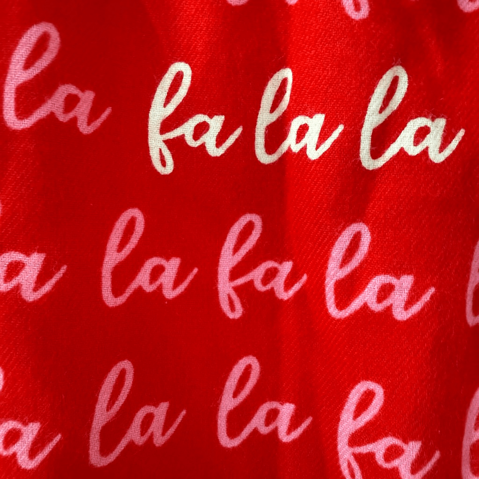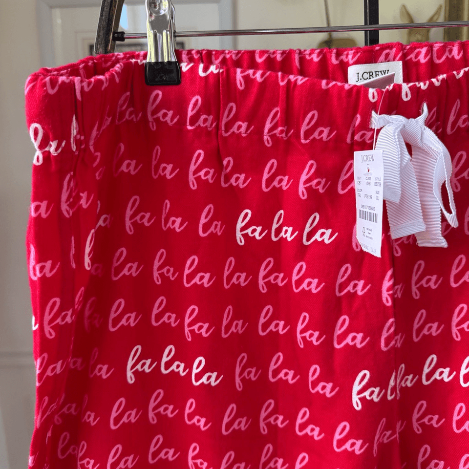 New with tags J.Crew 100% cotton flannel red fa la la drawstring pajama bottoms. Laying flat measures 18 inches straight across the waist with the waist released with a 13 inch rise and 30 inch inseam. Retail for $60.