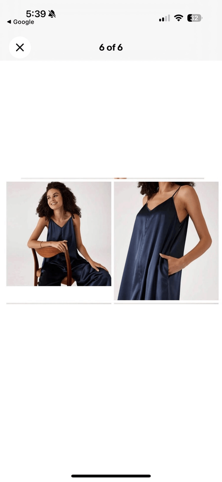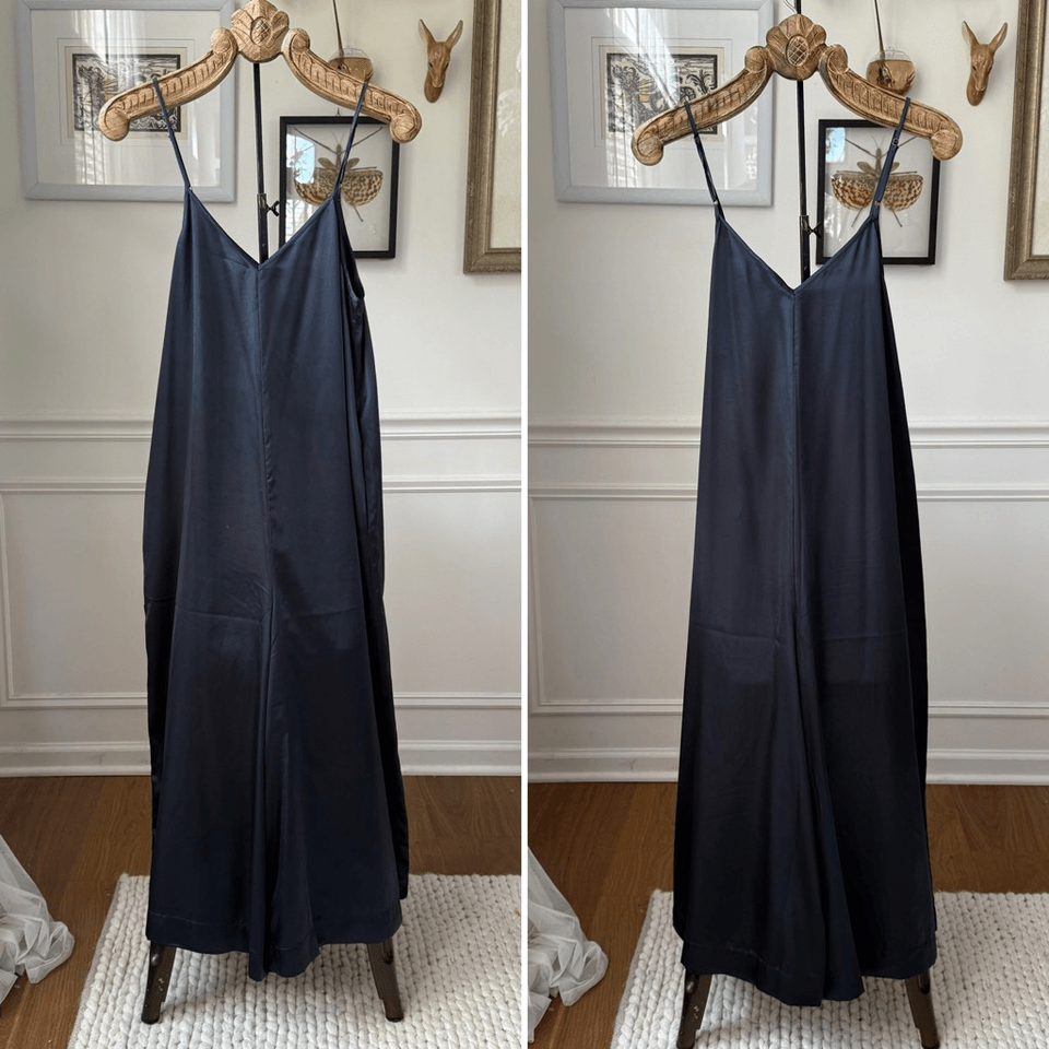 Mersea Coco Satin Sailor Jumpsuit in dark blue with gray undertones and adjustable straps. Hip pockets. Super wide leg and polyester satin with the touch of spandex for stretch. Tax size S/M. Laying flat measures 19 inches armpit to armpit 23 inches straight across the waist, 25.5 inches across the hip and a 19.5 inch inseam with an 18.5 inch leg opening. This is a little bit drop waste so although it is cropped, it?s a little longer than you think. It is approximately 35 inches from shoulder to crotch seem to give you some reference. As pajamas or loungewear these are of course, quite flexible and comfortable.