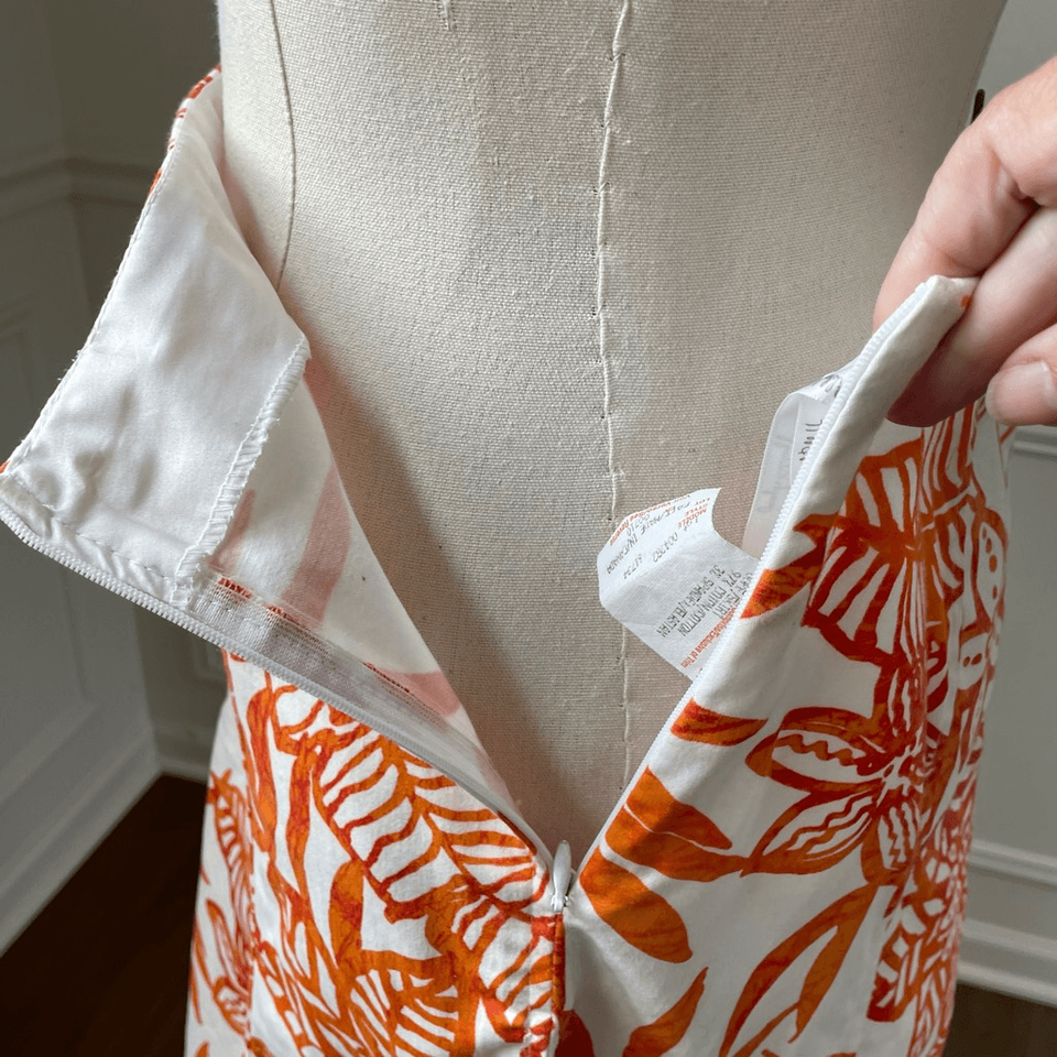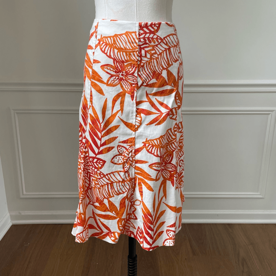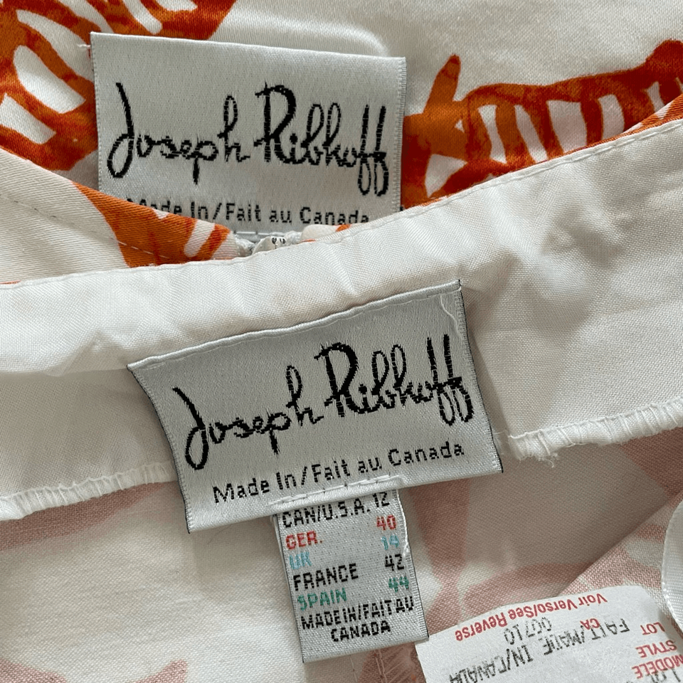 Joseph Ribkoff orange, print abstract, floral skirt, suit, including two pieces, the skirt and a zip front jacket. The jacket has an interesting cut out feature down each arm that is open and linked with white O-rings down the length of each arm. Jewel neckline, and a 2 way zipper that zips up from the bottom and down from the neck. The zipper pulls are an ivory color ring and the paint is chipping, most notably from the top pull. The skirt is side zip, and trumpet cut. Cotton and spandex blend. Tag size 12. Laying flat. The skirt measures 16 inches across the waist and 24 inches long. The jacket is 22 inches shoulder to ham and 19 inches armpit to armpit.