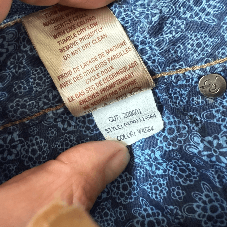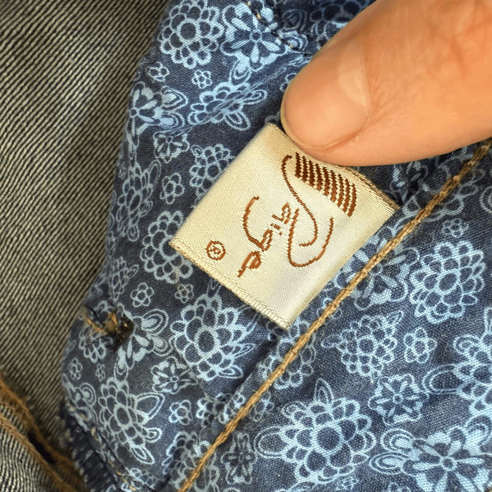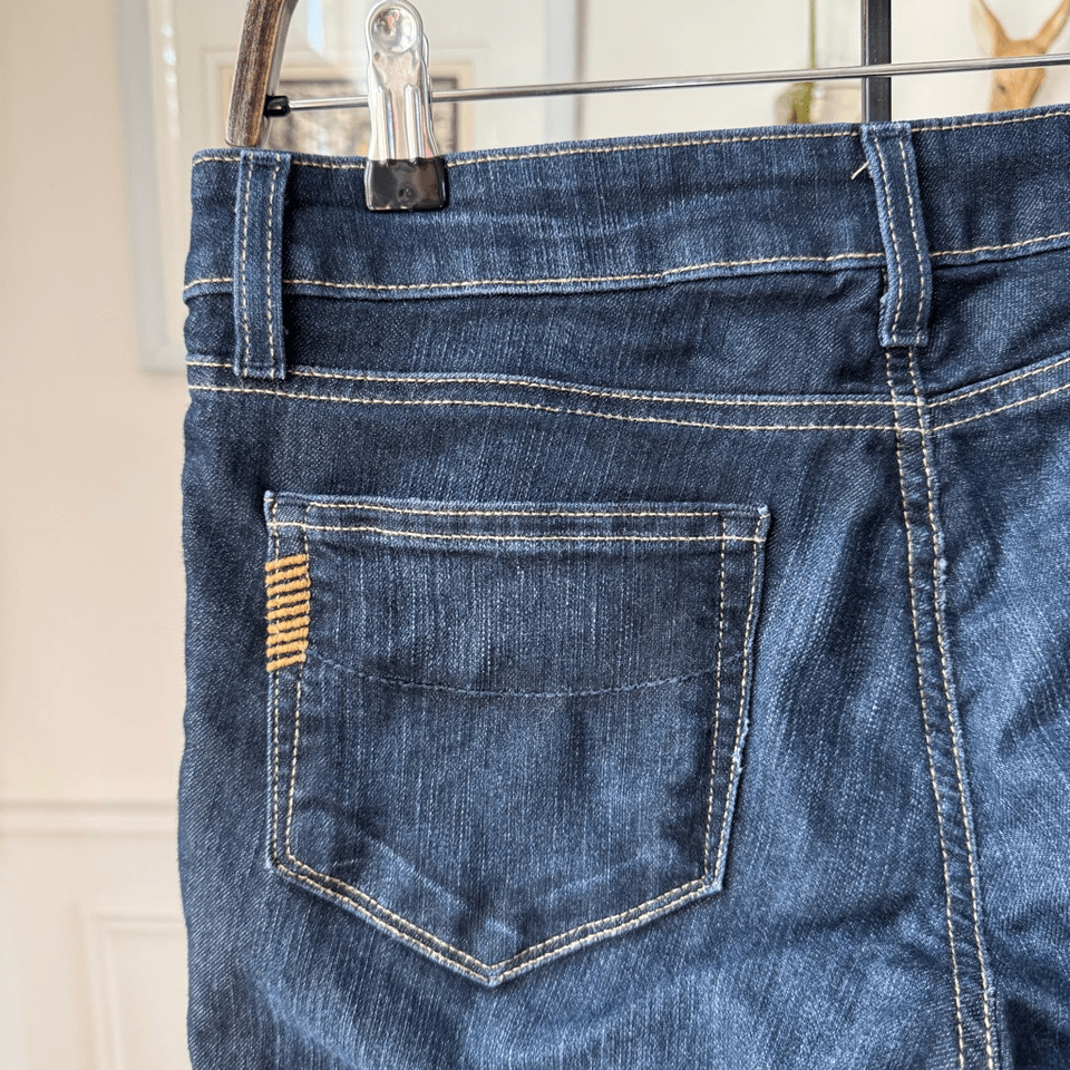 Page Laurel Canyon, dark blue flare jeans with low rise. Brand tag at the back waist band. Zip and button fly. Measurements are approximate and taken while laying flat: 8 inch rise, 14.5 inches straight across the waist and 34? inseam. Cotton, poly and spandex blend. There is a putter on the front near the fly that is only evident when they are not being worn.