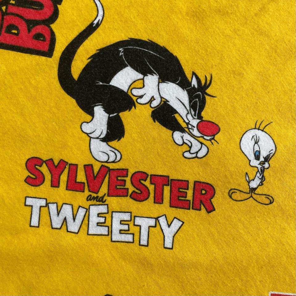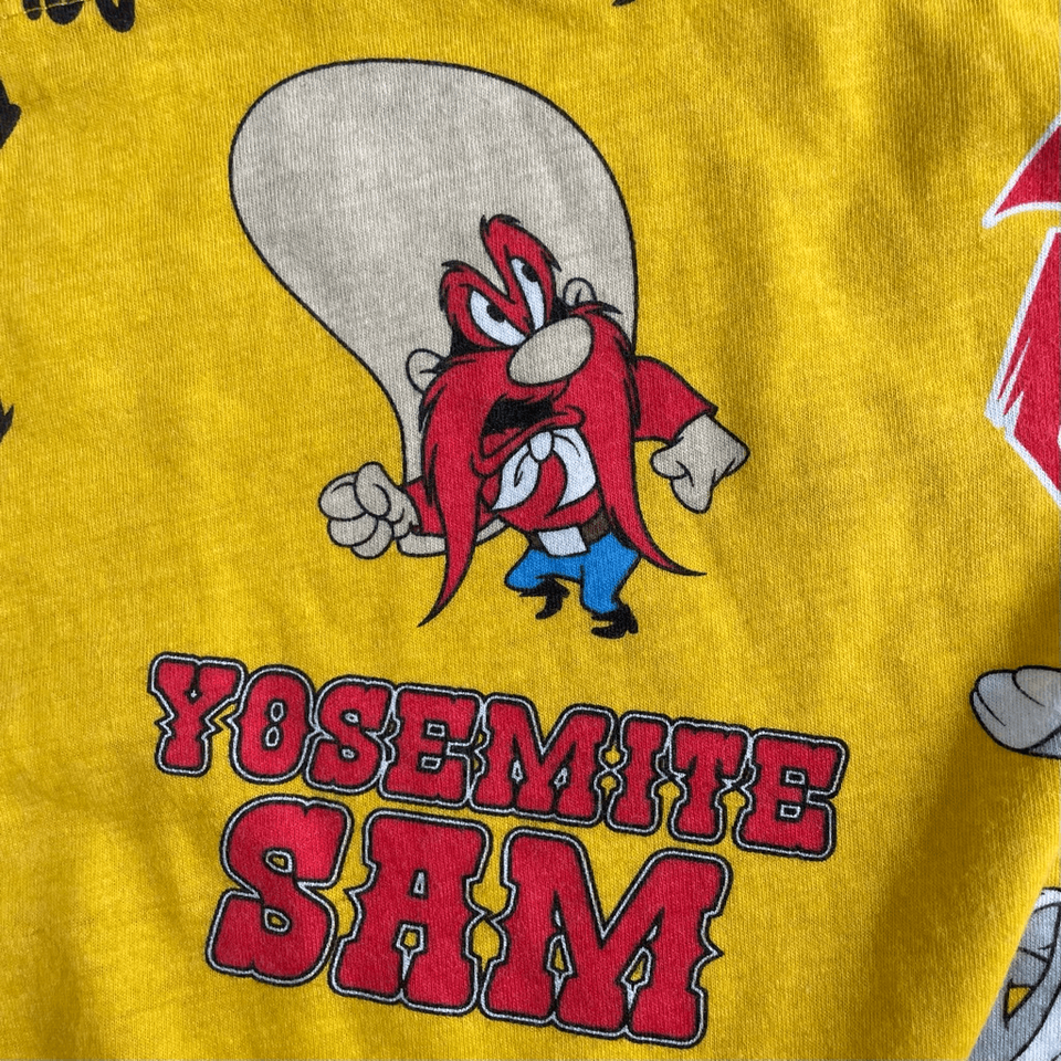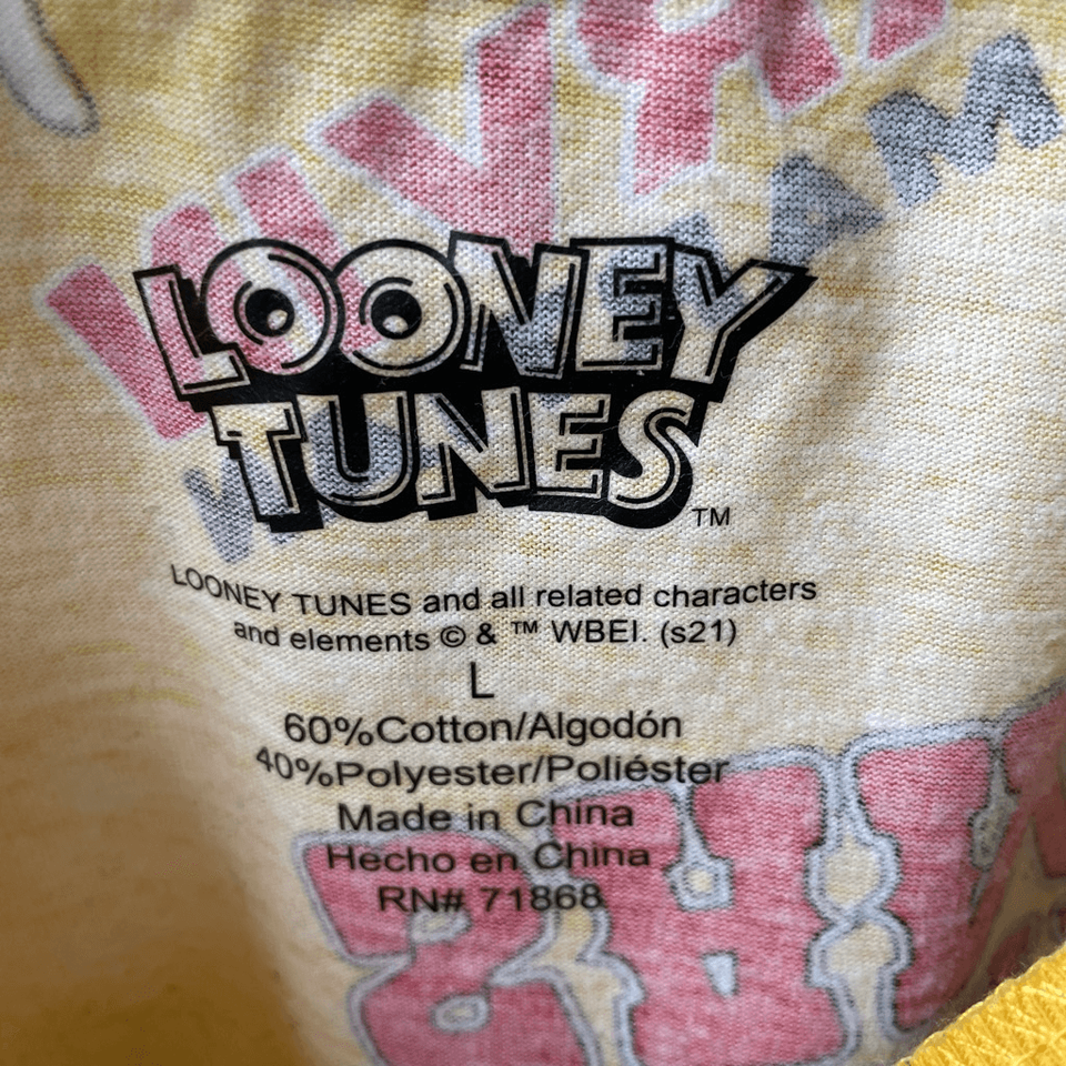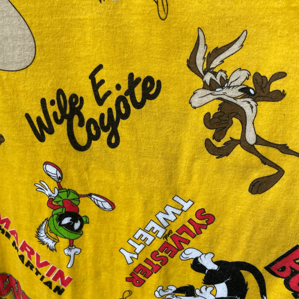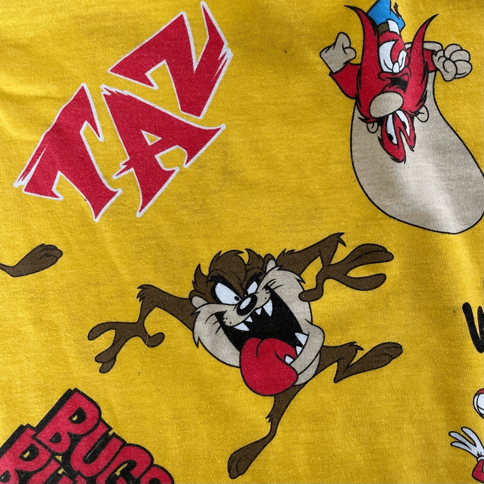 Warner brothers, Looney Tunes, bold, yellow, all over, print on a short sleeve T-shirt, featuring Bugs Bunny, Daffy duck, Sylvester and tweety, the Tasmanian devil, and Wiley coyote. Print wraps across the front to the back. Polyester and cotton blend. Laying flat measures approximately 26 inches shoulder to ham and 22 inches armpit to armpit.