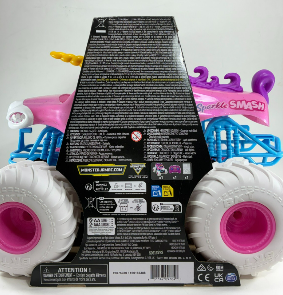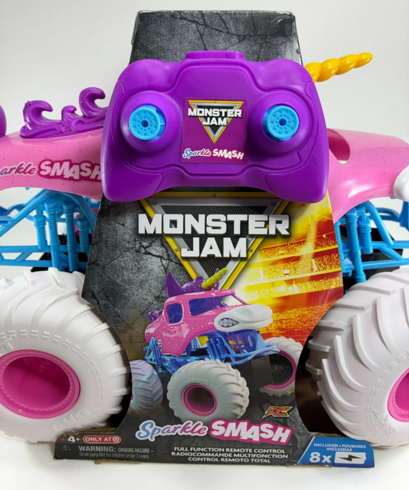 Bring some unicorn fun with Monster Jam action with Sparkle Smash RC. This 1:15 scale remote control Monster jam monster truck is ready to roll with 8 batteries included to start the action, indoors and outdoors. With soft rubber tires, authentic graphics and details, pull off epic maneuvers like you are driving the real thing with the full function, easy-to-use remote control. With 2.4GHz frequency, you can race up to six toy vehicles at once and control the Sparkle Smash remote truck from up to 250 feet away for up to 75 minutes. With so many other Monster Jam trucks and remote control cars to collect, add Grave Digger, Max-D, El Toro Loco and more (each sold separately) to your collection and race them all! Rev up your Monster Jam toys and get ready to experience the dirt-flying, car-crushing action of Monster Jam at home to ignite passion and adventure in any fan! Includes: 1 Sparkle Smash RC, 1 Instruction, 1 Remote Control
