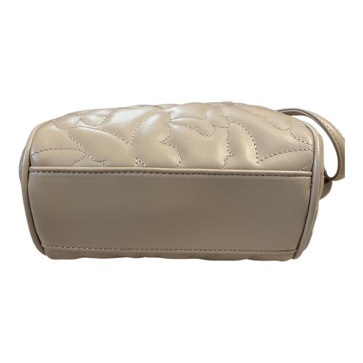 Betsey Johnson mini satchel featuring an allover quilted butterfly design in soft beige faux leather. This structured handbag includes dual top handles and a detachable long strap for crossbody wear. Finished with a zip-top closure, branded hang tag, and signature Betsey Johnson interior lining. A playful yet polished modern accessory, new with original tags attached.