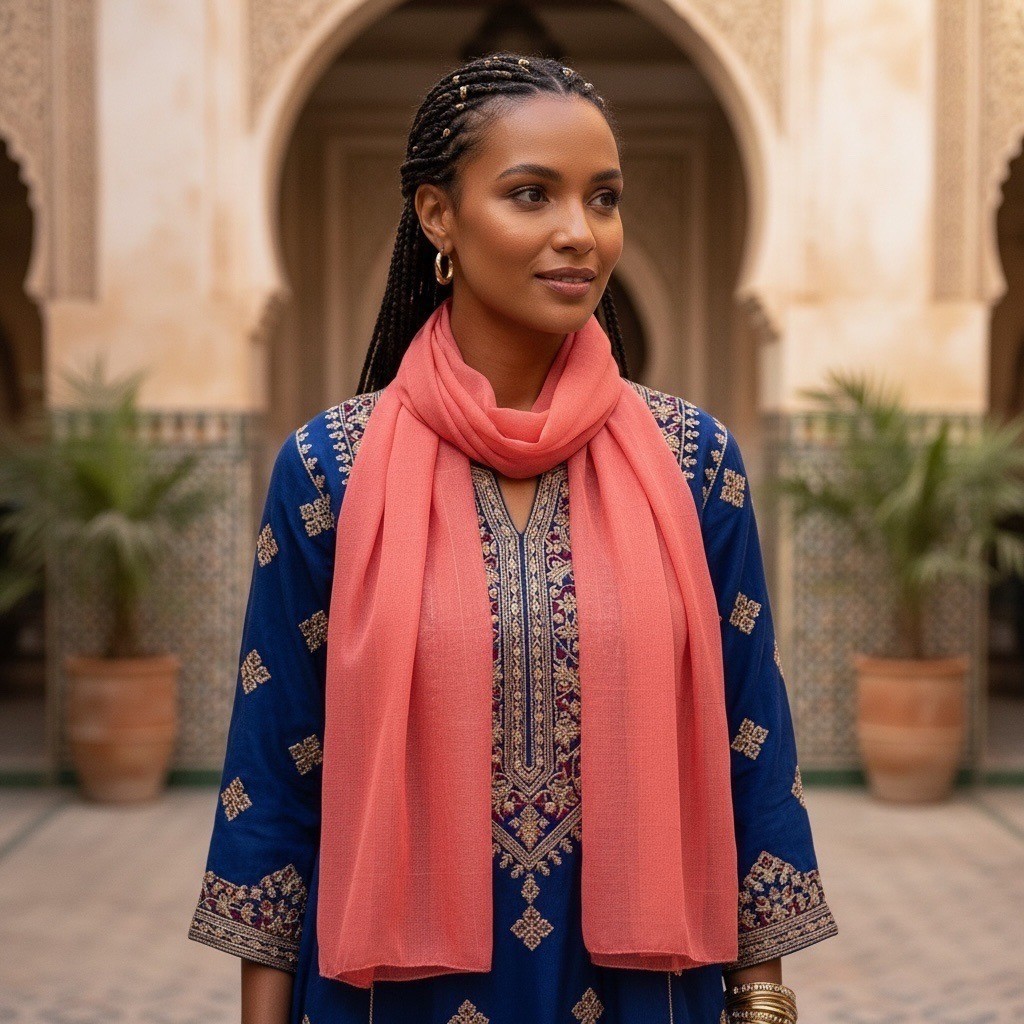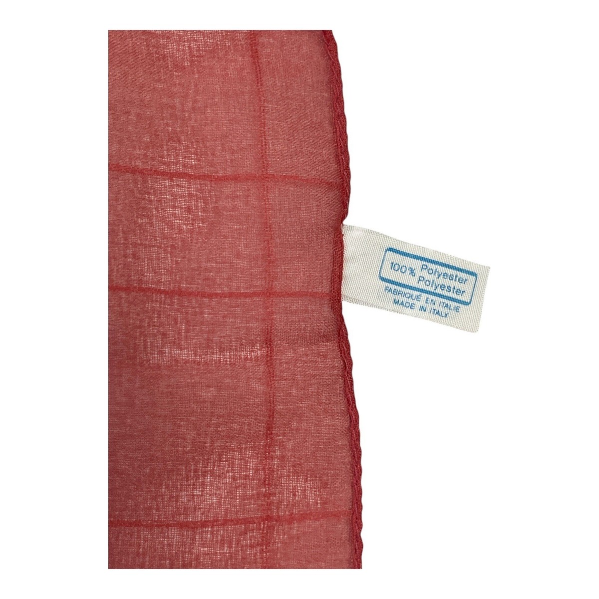 Elegant sheer coral scarf with a soft, lightweight drape and subtle woven grid texture. Made in Italy from 100% polyester, this piece works beautifully as a neck scarf, shawl, or light wrap. The semi-transparent fabric gives it an airy look that layers well for both casual and dressy styling.