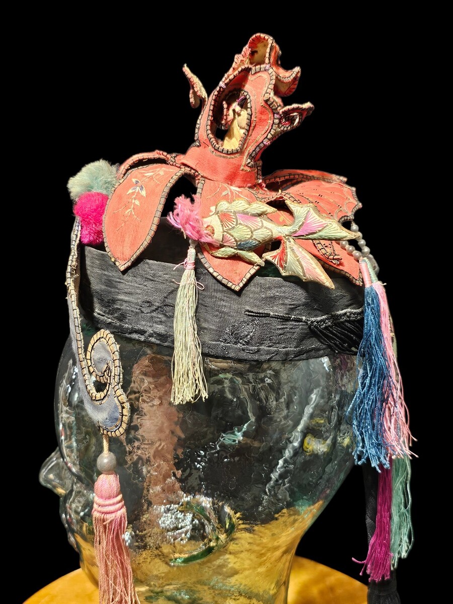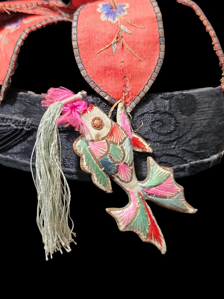 Antique Chinese Opera Headdress Silk Fabric Applied Embroidery Tassels c.1900