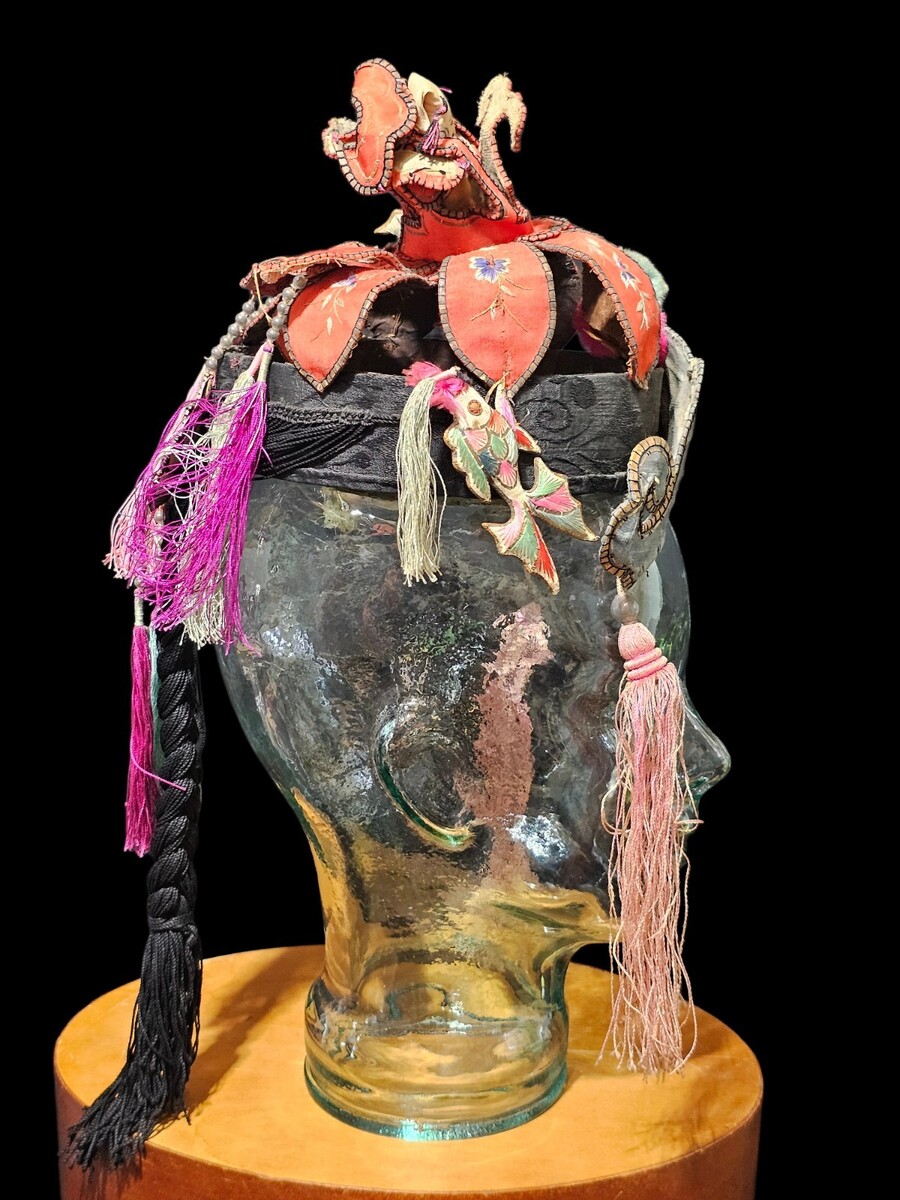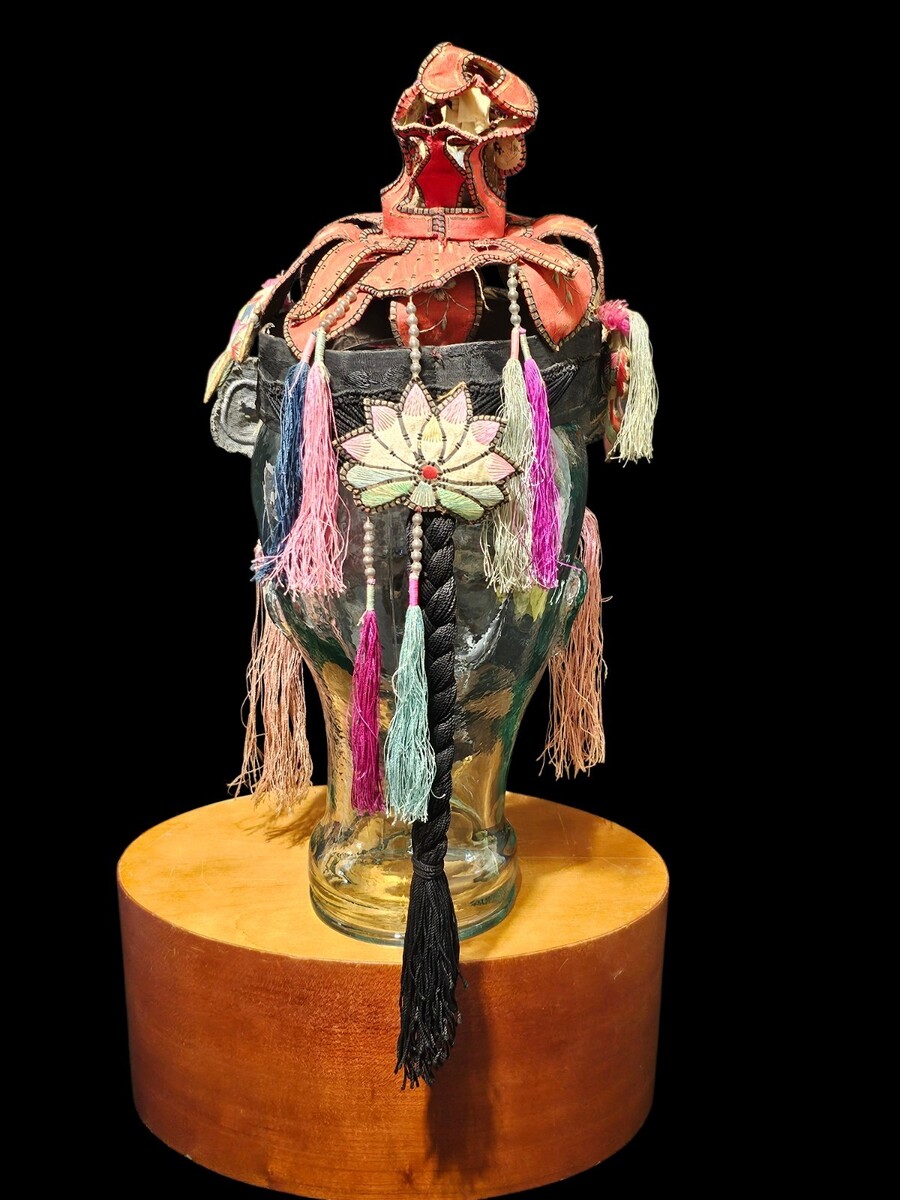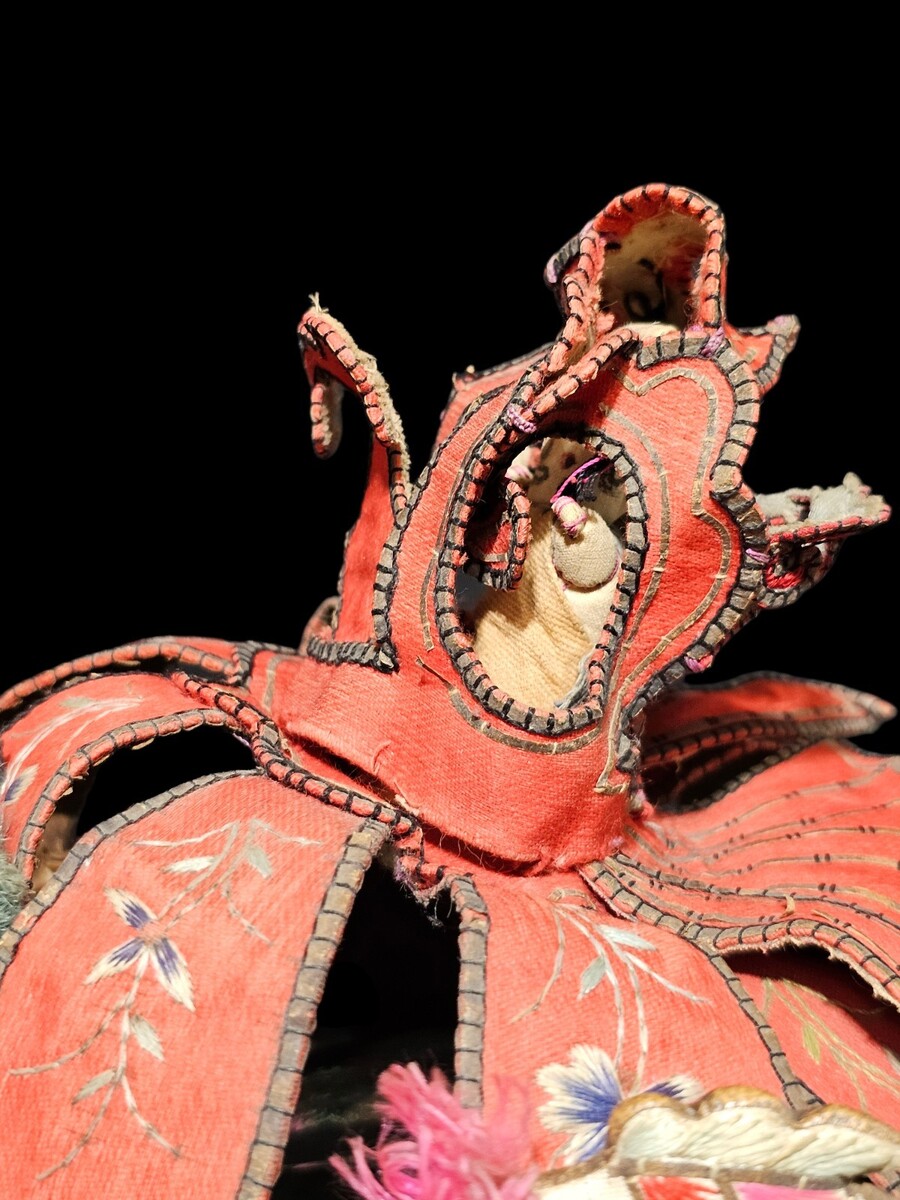 The headdress features layered silk panels with stitched edging, floral and auspicious motifs, braided and tasseled attachments, and early bead and cord embellishments. The interior contains a stuffed fabric head form with a hand-drawn face, likely used for shaping or storage between performances.