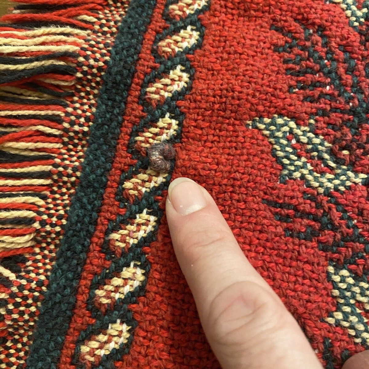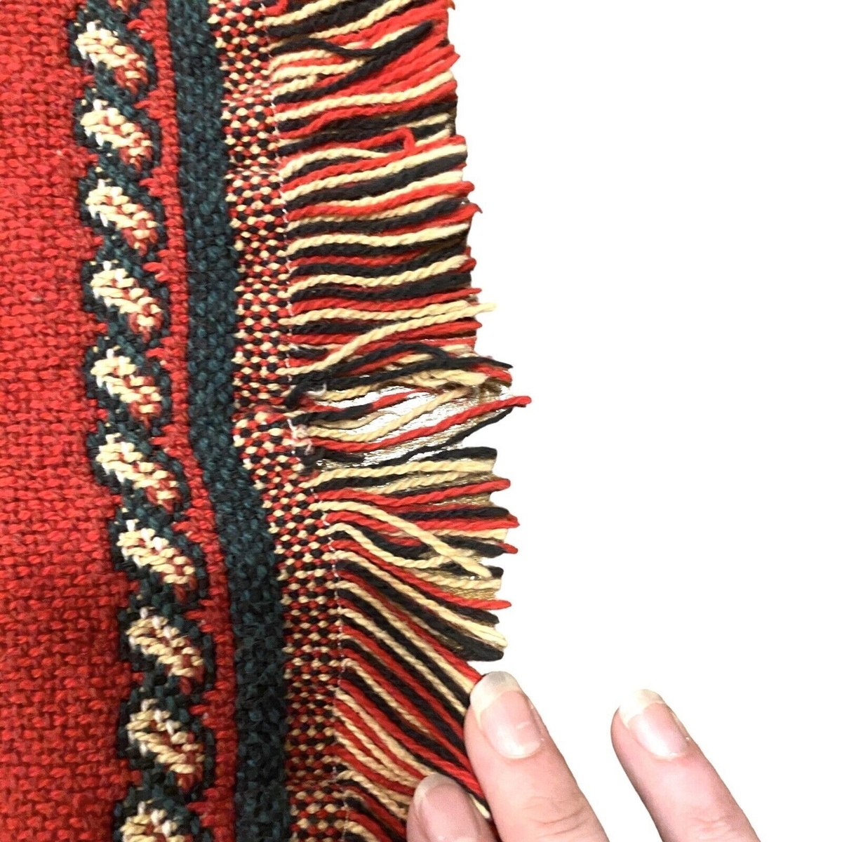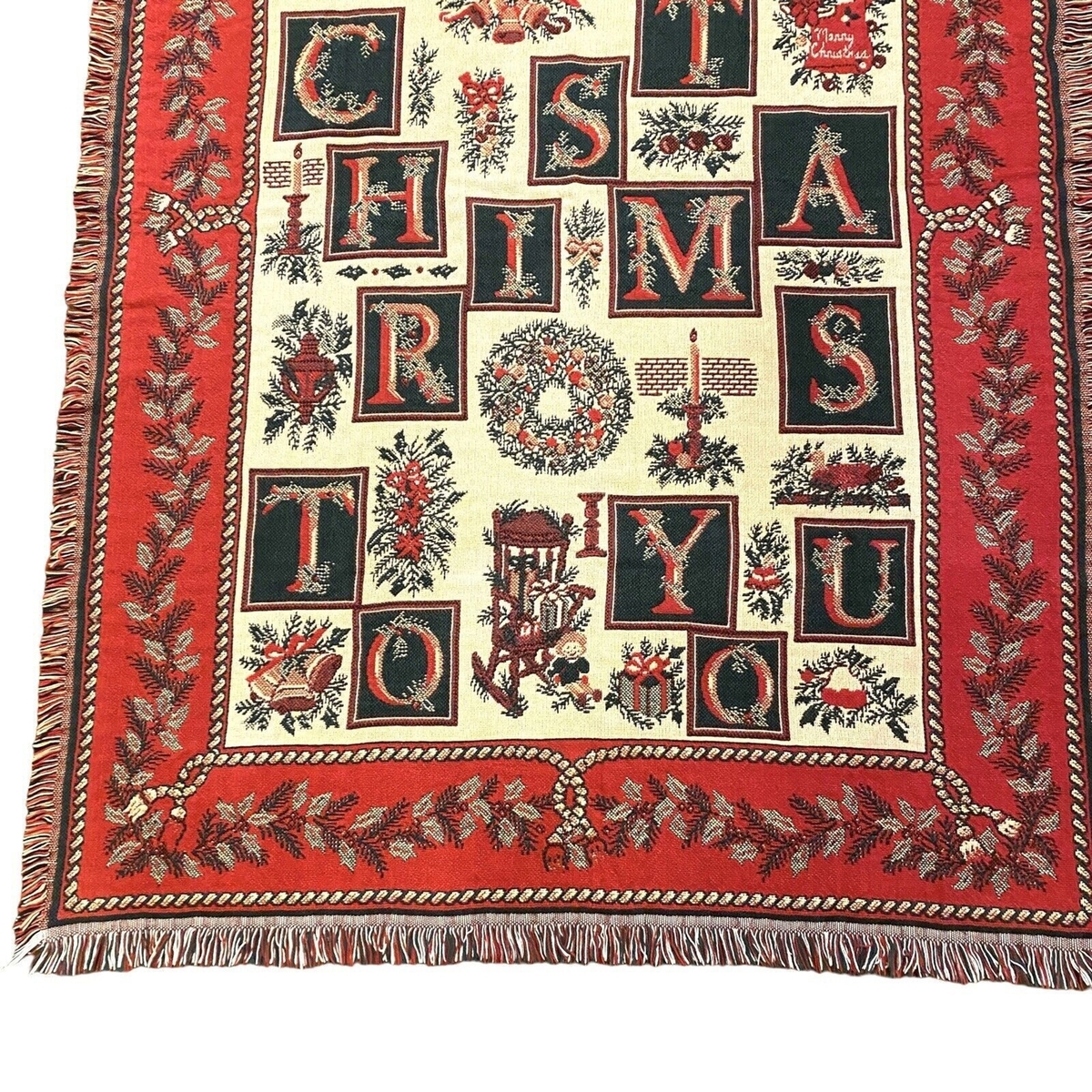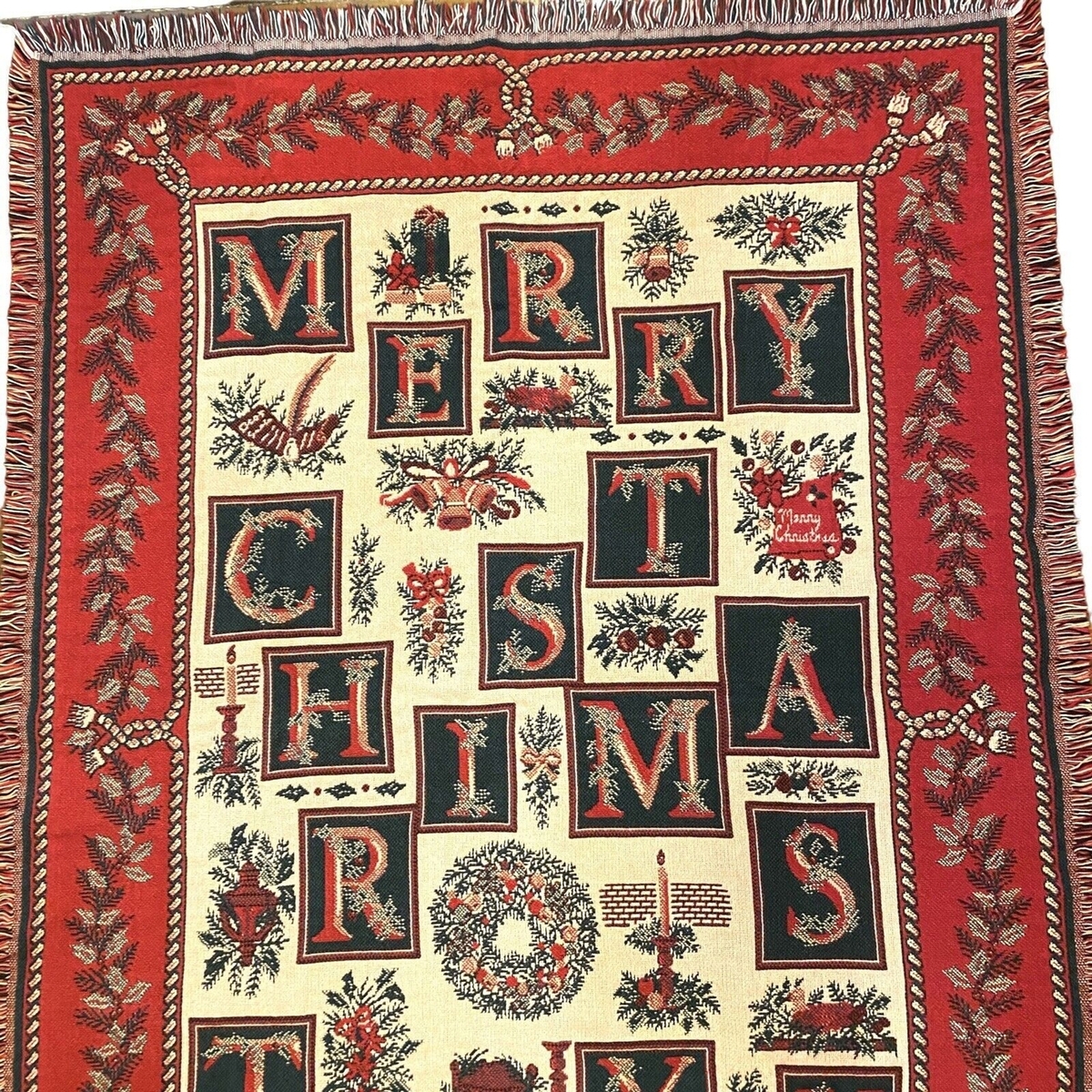 Beautiful red, green and cream Christmas tapestry throw by Goodwin Weavers. The fringed blanket measures about 70 inches by 40 inches and features a blocky Merry Christmas To You with images of holly, wreaths, candles and bells with a solid red border. 100% cotton. Machine washable. Made in USA. The blanket has been freshly cleaned and is in very good preowned condition with no tears, stains or holes. There is one pulled thread; please see pictures. From a smoke-free home. Ships next day!
