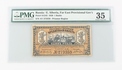 Sealed in a PMG holder with the title "Russia / E. Siberia, Far East Provisional Gov't // Pick# S1245 1920 1 Ruble // S/N AV 273359 - Priamur Region"