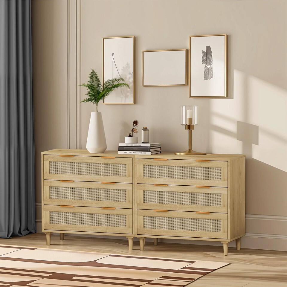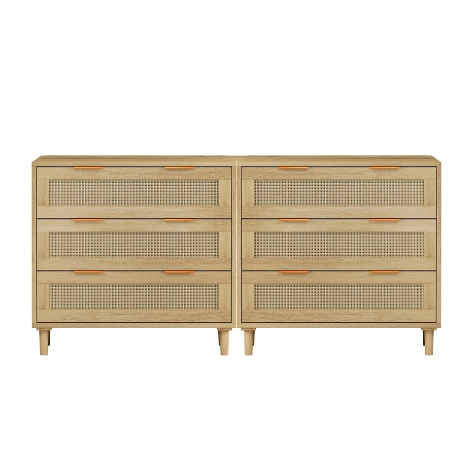 Modern Oak Rattan 3-Drawer Storage Cabinet Set - Bedroom Living Room