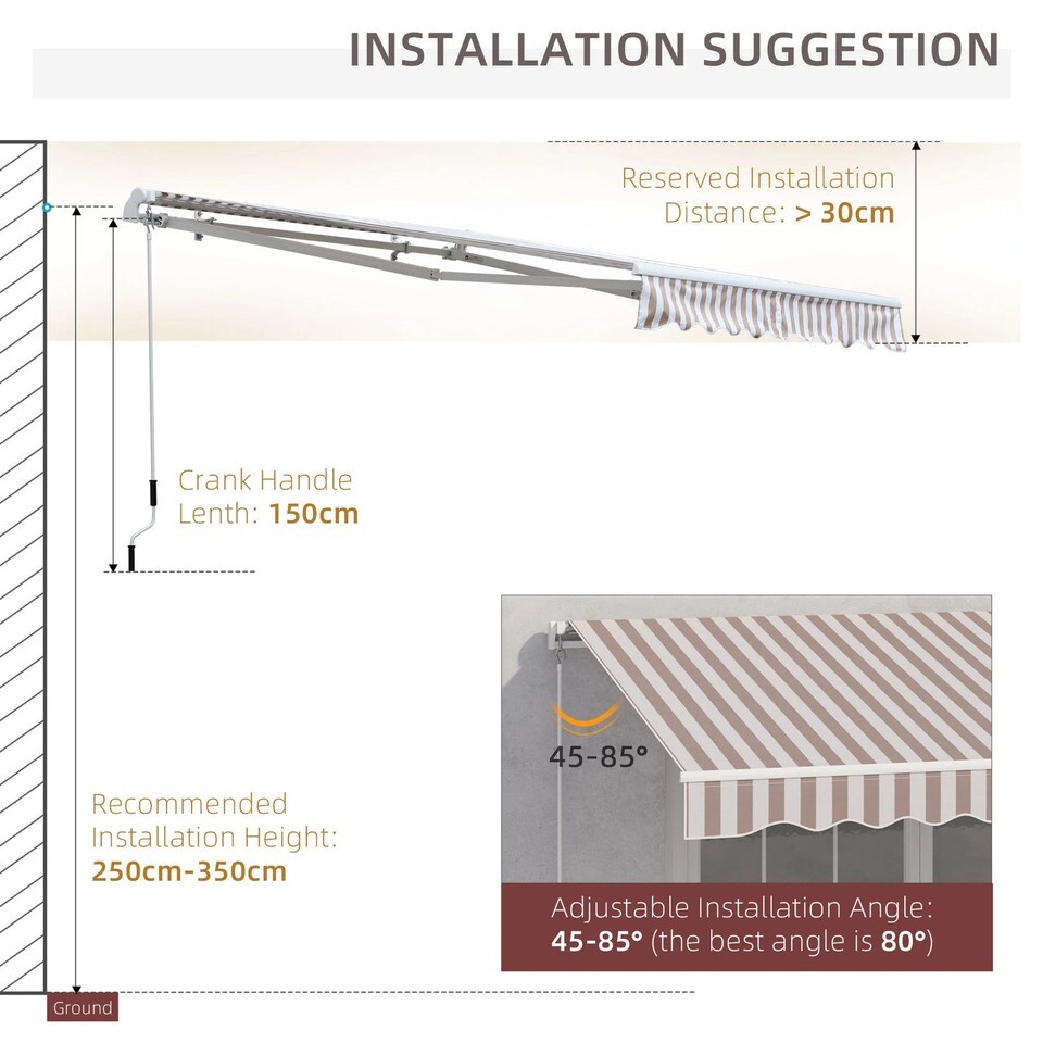 Versatile Placement: This retractable awning is excellent for placement above windows or doors. We recommend it be installed 98.5'?137.75' above the ground. Color coordinate your awnings for a clean and consistent look.