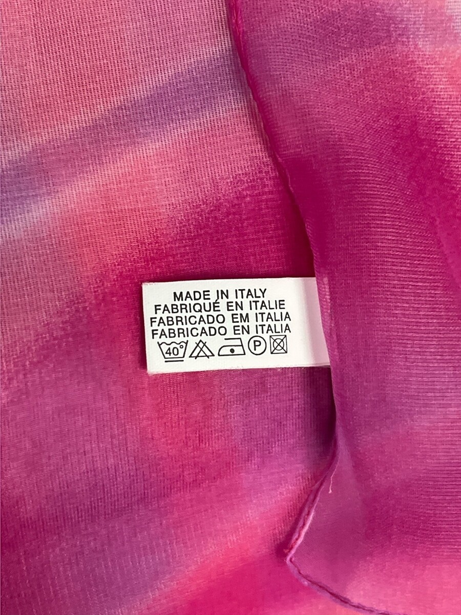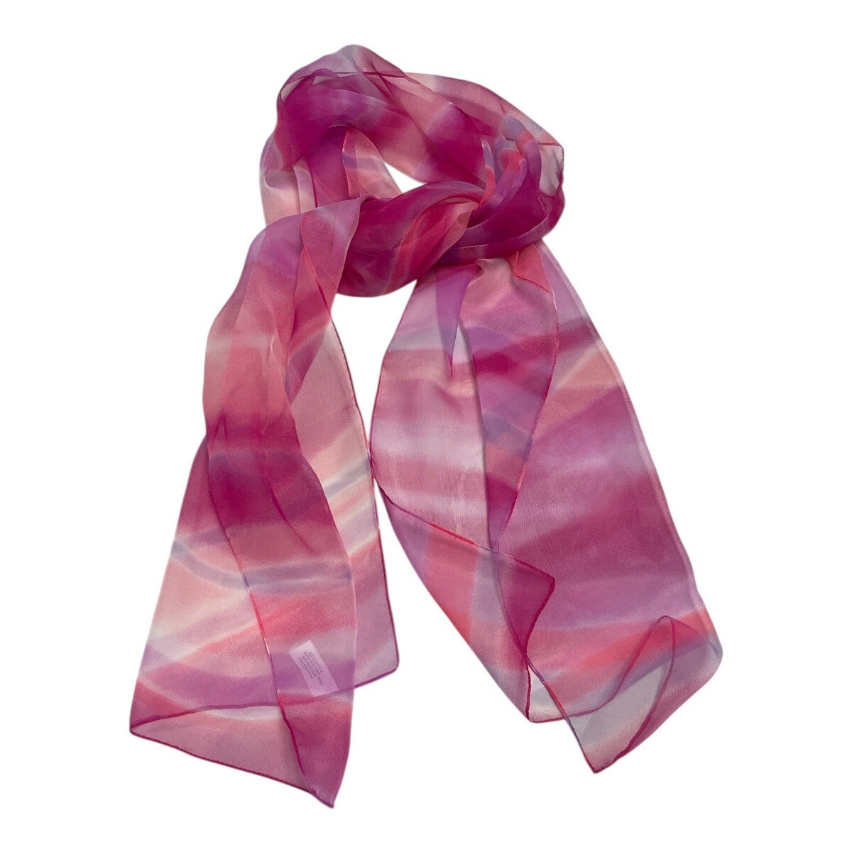 Vtg sheer scarf made in Italy, featuring a flowing wave pattern in layered shades of pink, rose, and blush. The lightweight fabric and romantic color palette reflect the soft, feminine aesthetic of early 2000s fashion, ideal for draping, styling, or light layering.