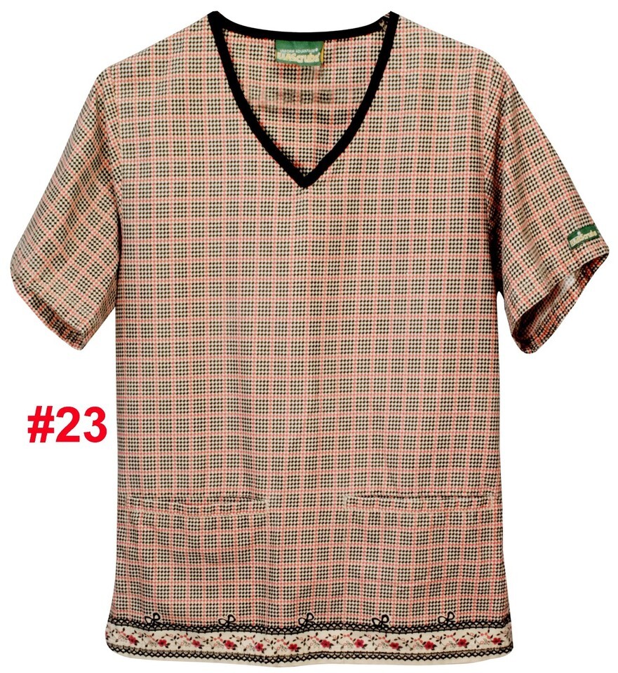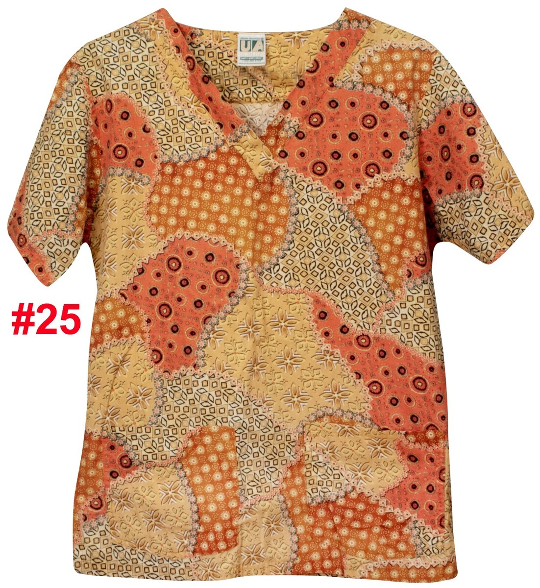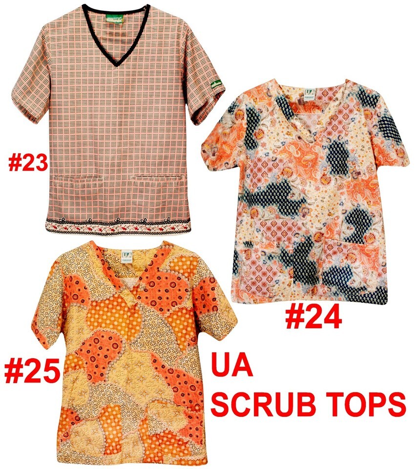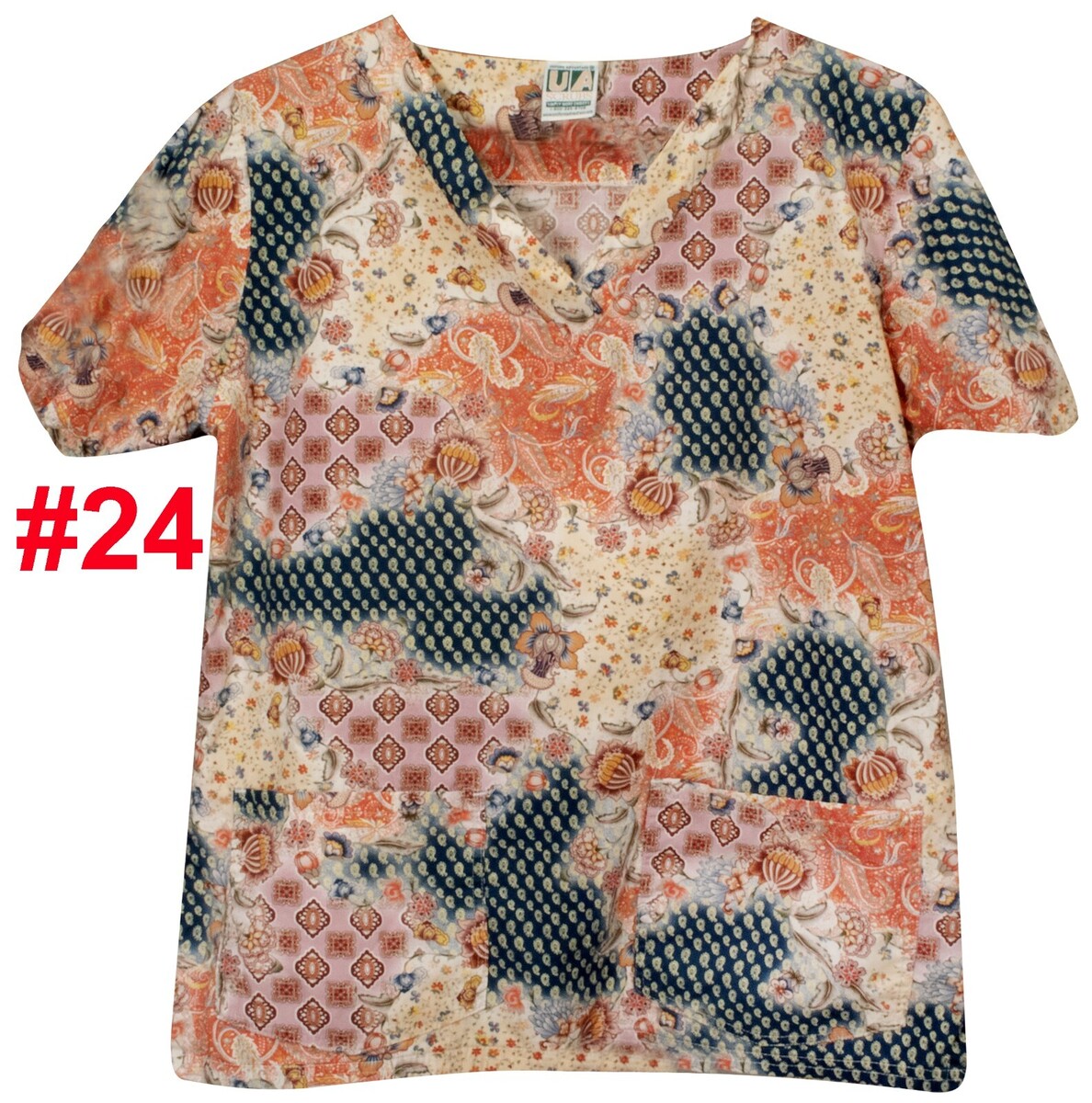 UA SCRUBS TOP SMALL PRINT PATTERN 100% COTTON 2 POCKET V-NECK WOMEN DRY CLEANED