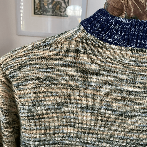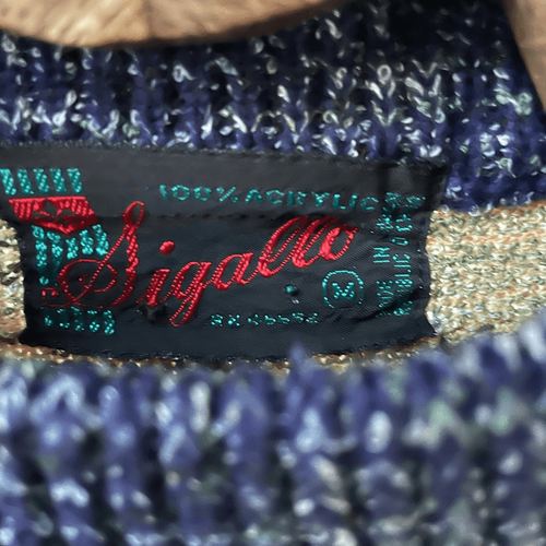 Vintage 70s Sigallo abstract tree acrylic mock neck space dye Colorblock banded sweater. Shades of green and blue both a touch of dark red. No noted holes, stains or flaws. Laying a lot measures approximately 25 inches shoulder to ham and 20 inches armpit to armpit. Tag size medium. Made in Taiwan Republic of China.