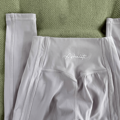 New with tags, Alphalete kinetic pulse Dusty lavender leggings with raised script logo across the back waistband and 28 inches seam. $70 retail.