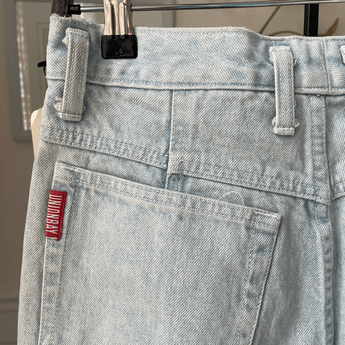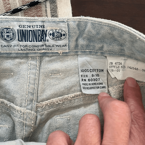 New with tags, new old stock 90s Union Bay high rise pastel tie-dye denim Jean cut off shorts. The tags are from Hudson?s department store. 100% cotton with button and zip closure. The rise is high at 12 inches. Laying flat measures 12.75 inches straight across the waist and a 4 inch inseam. The hem is scissor cut and they hem on one leg is dip dye tie dye in pastel shades. The opposite hip has the same tie-dye. Made in Hong Kong. Please note that the tag size is 9/10, but that is vintage sizing. Based on the waist measurement, I think this would fit a modern size 2 or four best but please double check measurements to ensure the proper fit for you.
