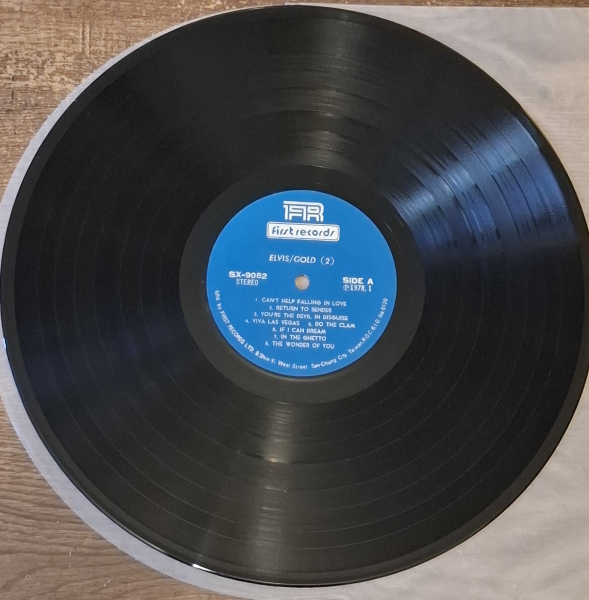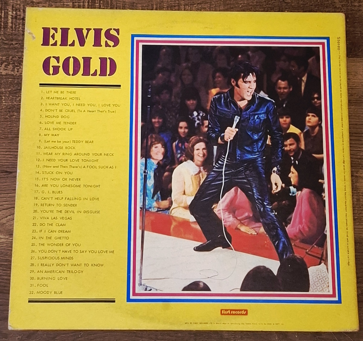 Vintage Taiwan pressing vinyl LP set of Elvis Gold, issued by First Records in 1978. This is the Taiwanese edition with blue First Records labels and original lyric insert included.