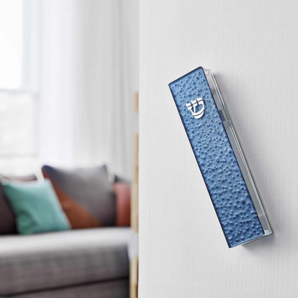 Bullet point: This blue pebbled glass mezuzah cover features a handcrafted artistic design enhanced with silver-toned accents that highlight its textured surface. The gradual blue color shift creates a visually striking gradient, making it an elegant decorative element for any doorway. A refined art piece that elevates both traditional and contemporary home decor.