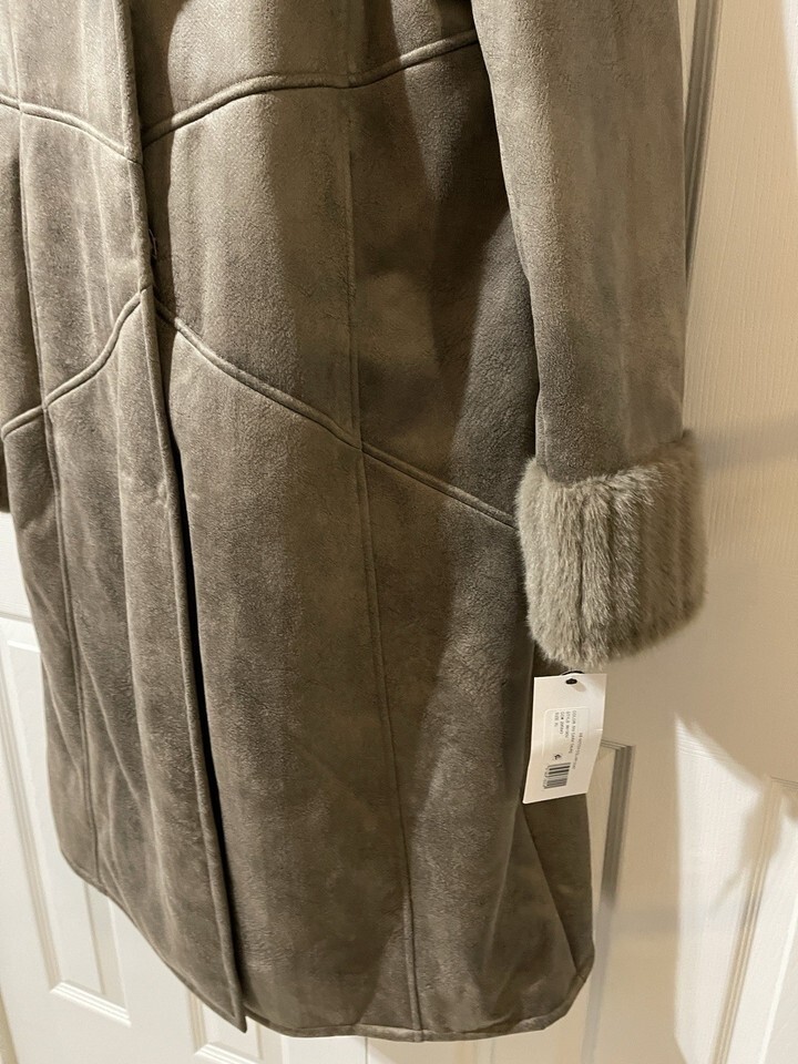 This coat was recieved as a gift and is new without tags. The outer material is a soft faux suede. The inner lining is completely faux fur with details of the same fur on the sleeves and collar.