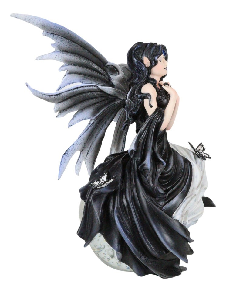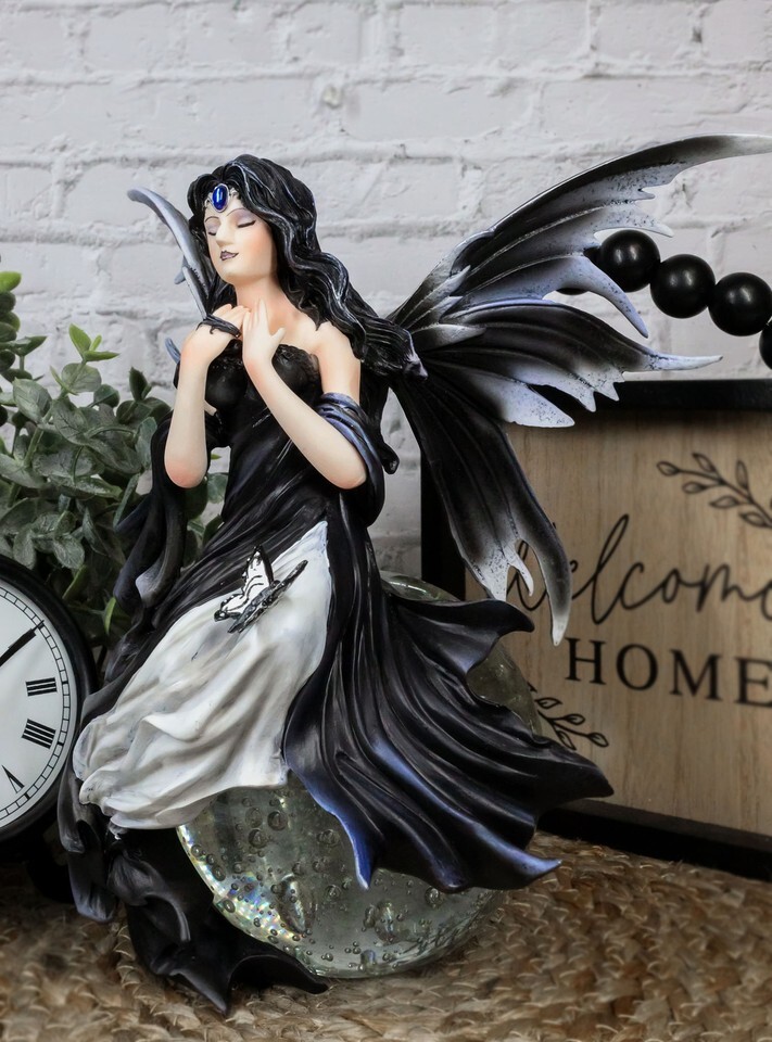 ? Fairies associate with many different forces of natures. The Gathering Storm Fairy Crystal Ball showcases a fairy's relationship with the weather. A black gowned gothic fairy has her eyes closed, feeling the building energies of nature. She has black wings to match her dress. A blue circlet adorns her head and a small butterfly sits on her lap. She is perched on a crystal ball.