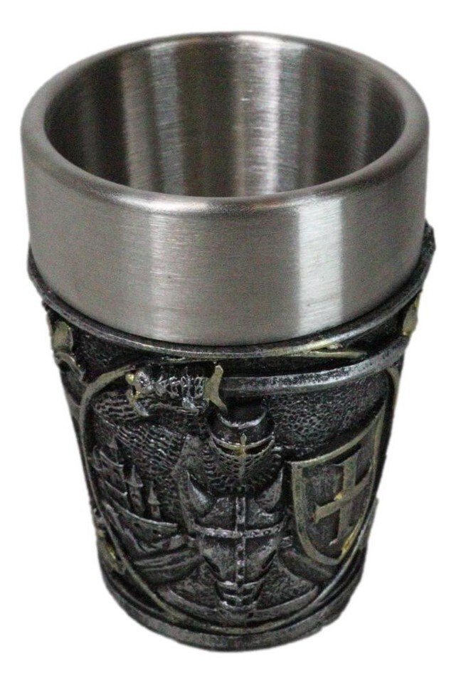 ? Each of these Medieval Crusader Knight shot glasses are made of polyresin with stainless steel inner cup liner. The sculptural housing is hand painted and polished.