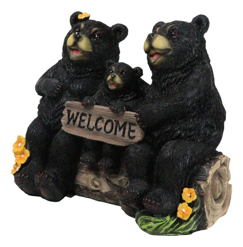 Papa Mama Black Bears and Cub Sitting On Log with Welcome Plank Sign Figurine