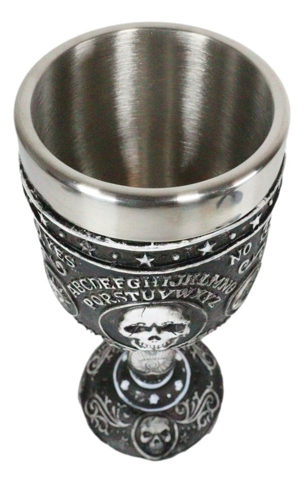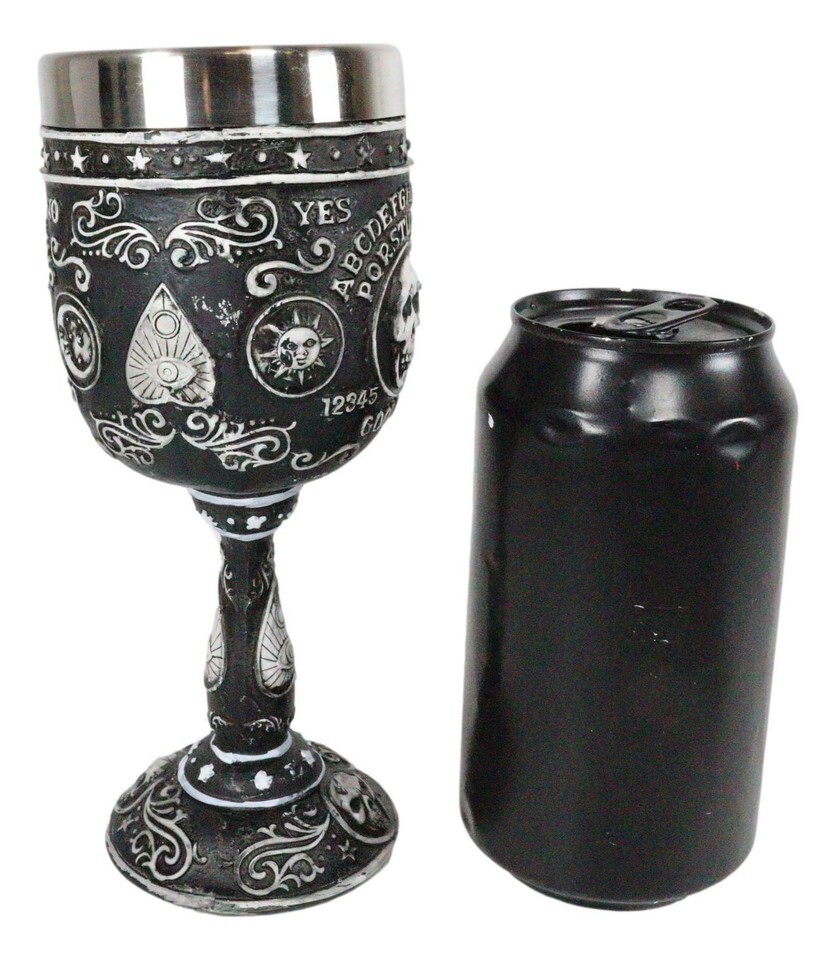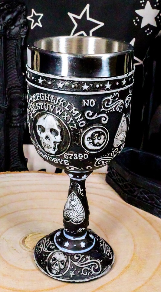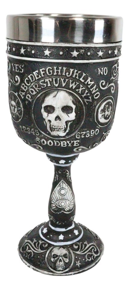 ? This Spirit Board Ouija Wine Goblet is made of fine polyresin with stainless steel cup insert, hand painted and polished individually.