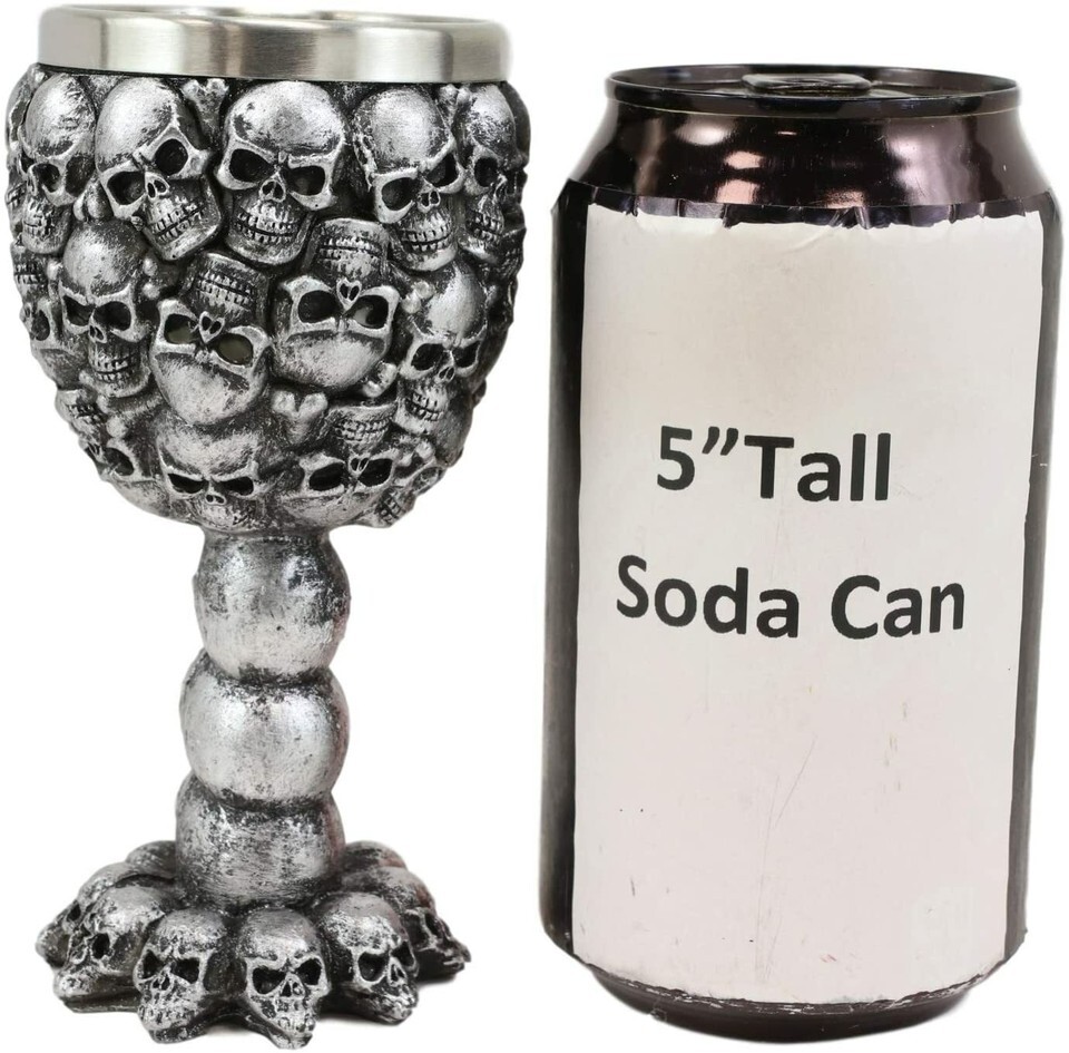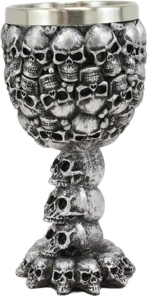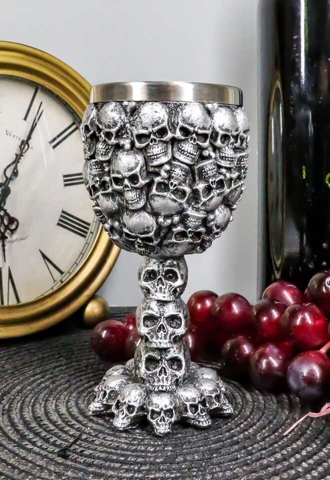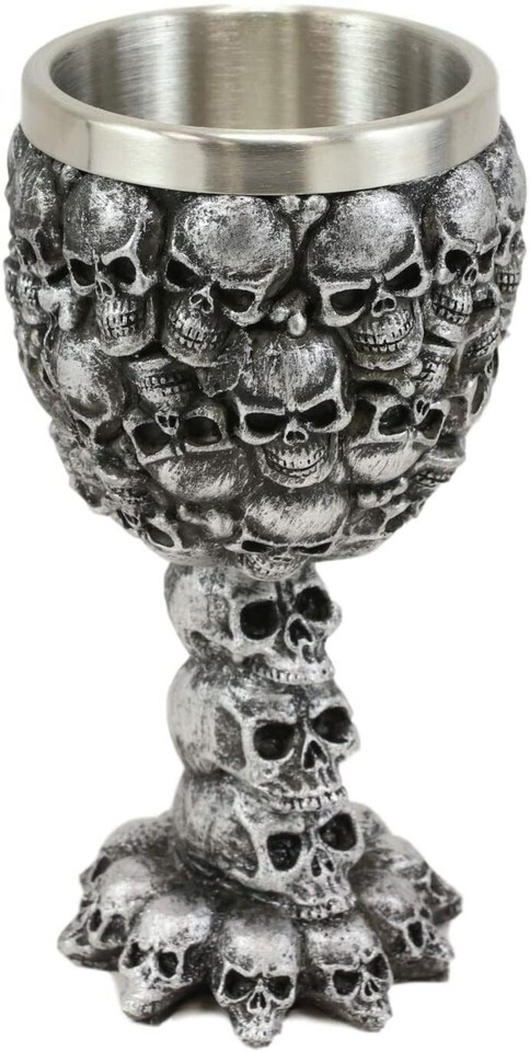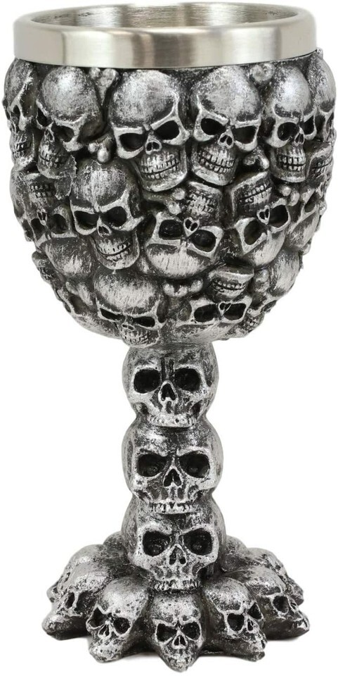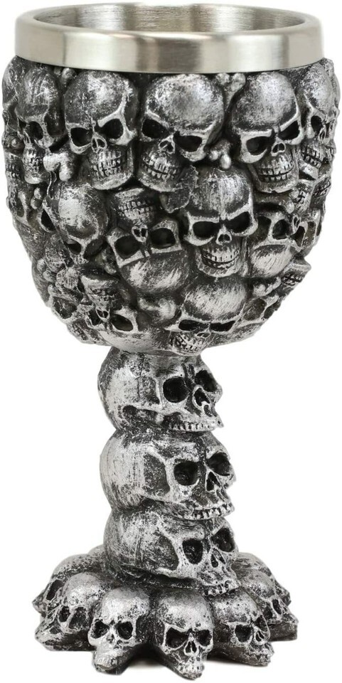 ? This Small Ossuary Skull Goblet is made of fine polyresin and stainless steel, hand painted and polished.