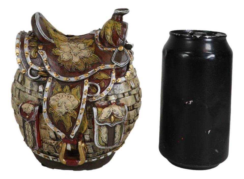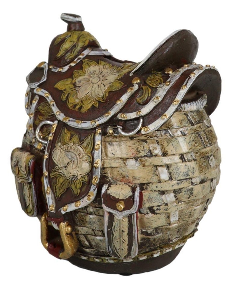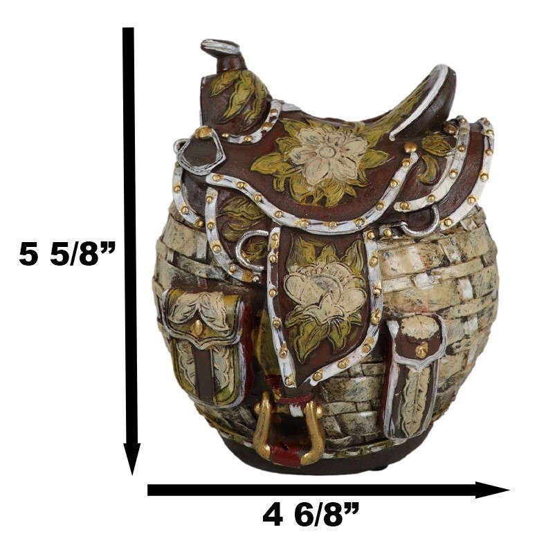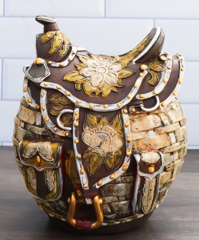 ? Discover a perfect blend of western charm and practicality with our Rustic Brown Horse Saddle Money Bank. This exquisite piece beautifully captures the essence of the wild west with its western horse saddle design adorned with intricate floral and wicker styling accents. Not just a stunning decorative item, it also doubles as a functional money bank, allowing you to save with style.