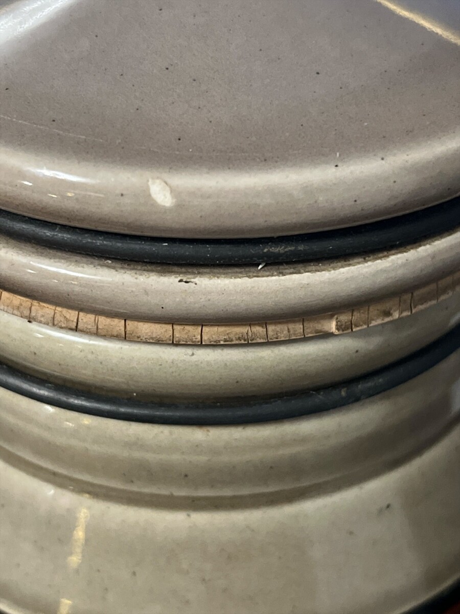 Good condition with light wear consistent with use and age. Small glaze chip on the lid edge and typical age-related wear to the gasket; no cracks noted. Please review photos for details.