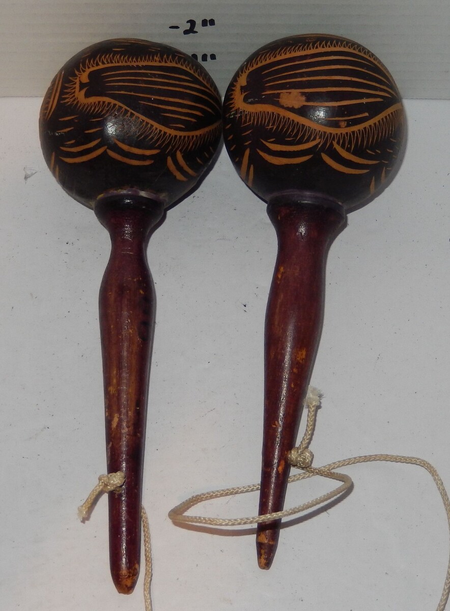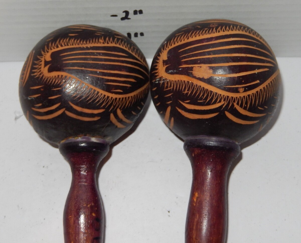 Condition: These maracas are in good vintage condition with a beautiful aged patina. Please see photos for close-up details on the etching and minor wear consistent with age (note the light scuffs on the wooden handles and gourd surface).