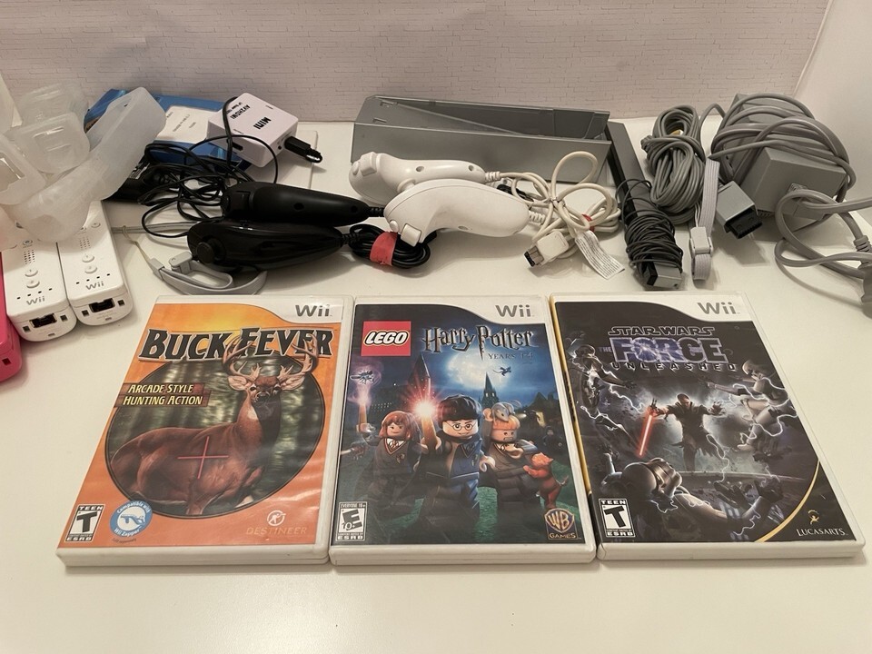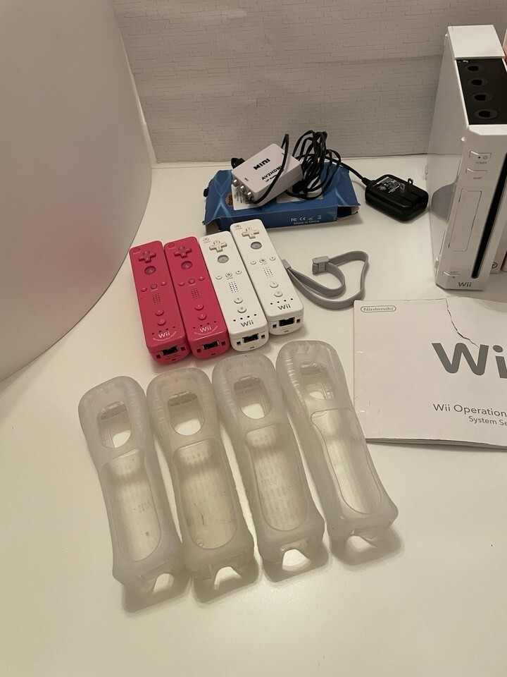 The Nintendo Wii Console Bundle includes a home console in white color, model RVL-001, manufactured in 2006. It comes with 5 games, 4 remotes with covers, AV2HDMI converter, Nunchuks AND MORE (see pictures). The console has a storage capacity of 512 MB and provides Component RCA connectivity. Perfect for gamers looking to enjoy a variety of Nintendo Wii games with this complete bundle.
