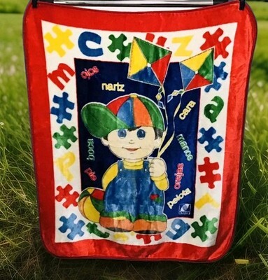 This vintage NOVATEX fleece throw blanket features a colorful pictorial pattern of a boy flying a kite.
