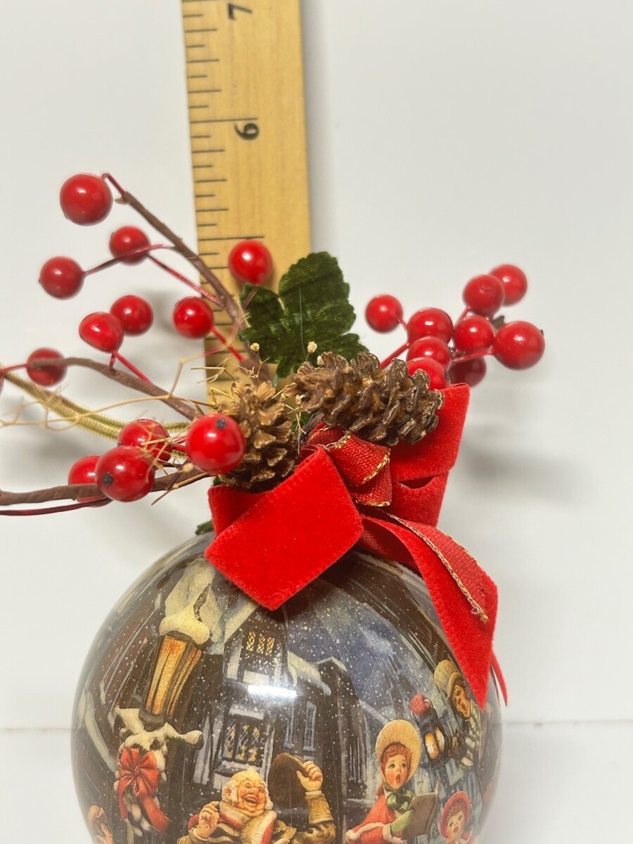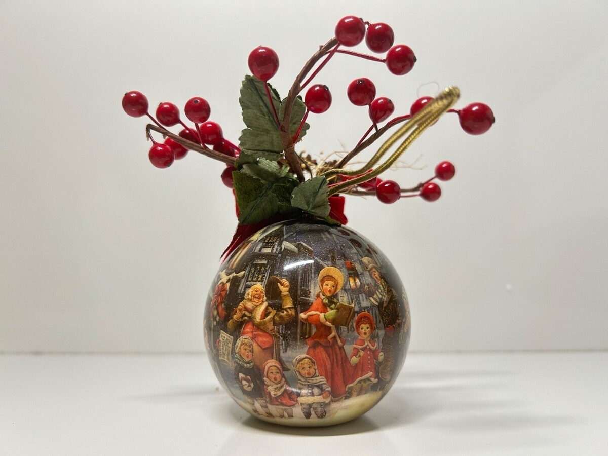 Capture the spirit of Christmas with this 1987 Simpich Carolers Christmas Ball Ornament topped with holly and berries. Expertly crafted in paper mache and protected in a plastic ornament by Tomorrow Today Corp., it's a timeless addition to your holiday decor collection.