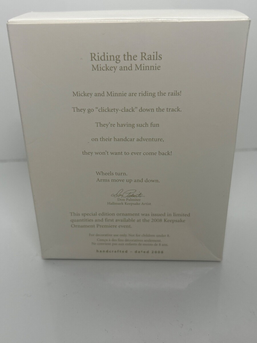 This 2008 limited quantityHallmark Keepsake Disney ornament of the beloved character?s Mickey Minnie brings nostalgic warmth and joy as they ride the rails on their very own handcar adventure.