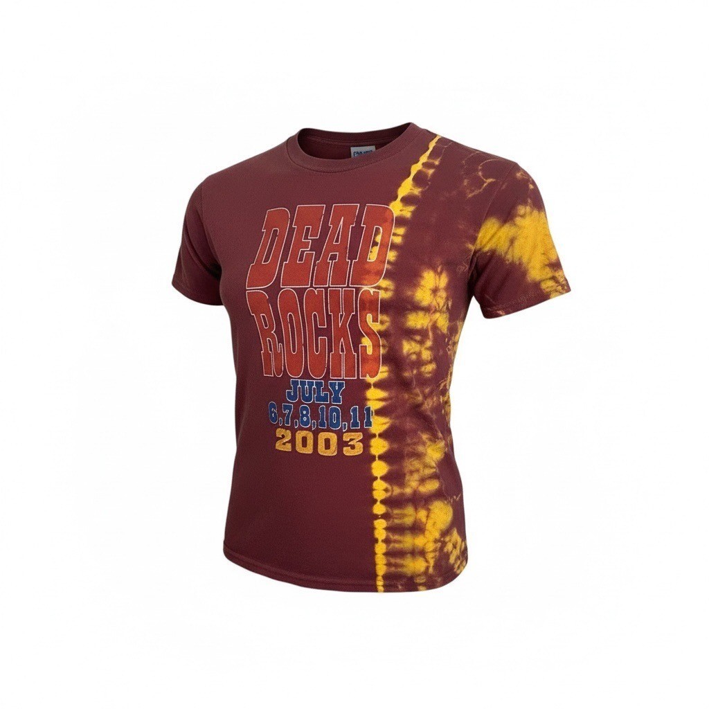 This t-shirt commemorates a Grateful Dead concert at the iconic Red Rocks Amphitheatre in Colorado, featuring a distinctive half tie-dye design in maroon and yellow with a cowboy-themed graphic. The shirt appears to be from a 2003 concert or commemorative series, representing the band's legacy that continued after Jerry Garcia's death in 1995.