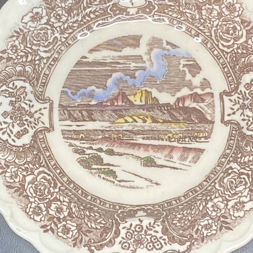 This bread plate is one of the plates from the Vernon?s 1860 series. It depicts a scene from the Pony Express, showing a rider on a horse carrying a mail bag across the prairie. The plate has a scalloped rim and a brown border with gold accents. The plate measures 6.5 inches in diameter and is marked with the Vernon Kilns logo and the name of the series on the back.