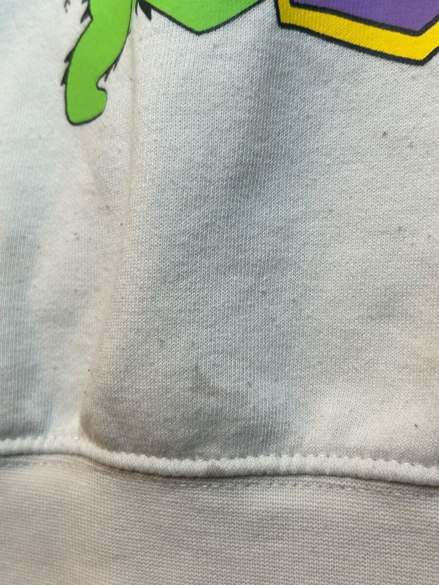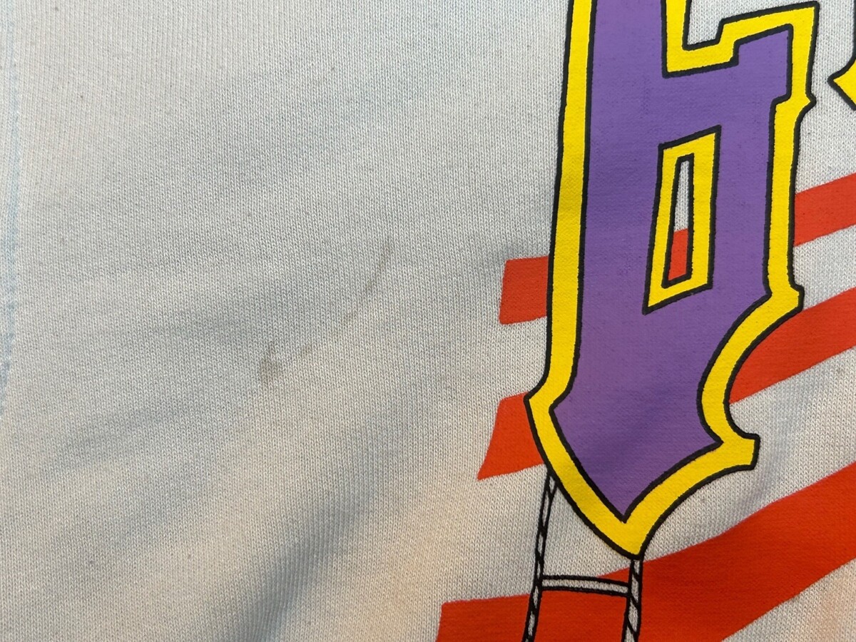 Item is in good condition overall but does have a few minor stains as seen in the final photos. These stains are not noticeable without a closer inspection and do not take away from the overall coolness of this shirt. Label on shirt states it to be a size small however please look at the visual measurements to see if this shirt will fit your needs.