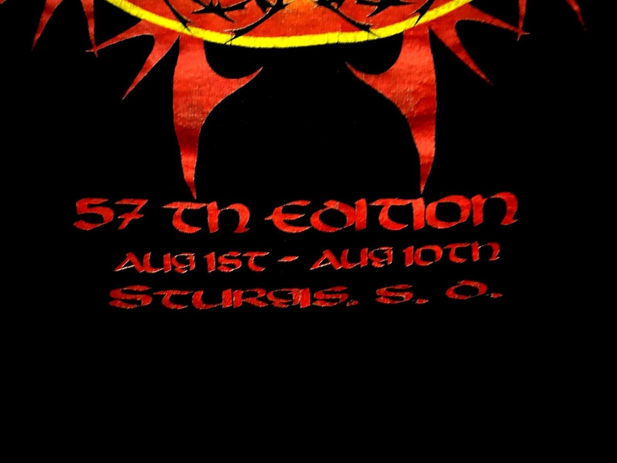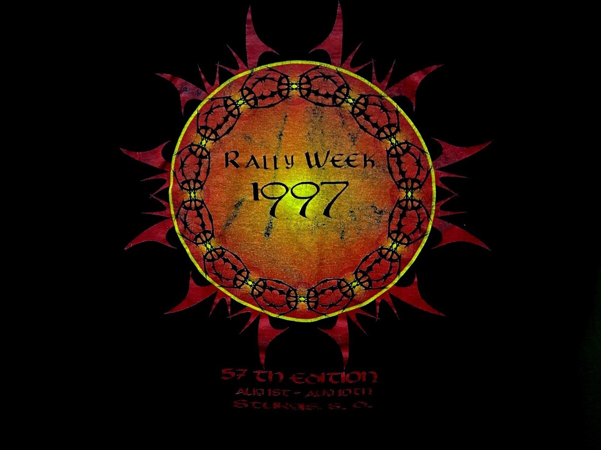 Rally Week 57th Anniversary Sturgis 1997 Jake The Fat Man Tee featuring a deep orange and red sun design