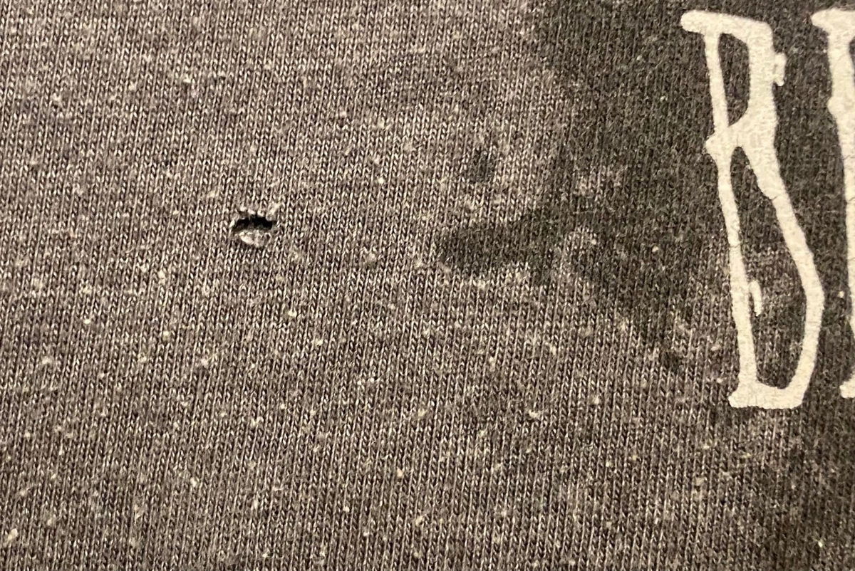 This shirt is in wonderful pre-owned condition as it was part of a collection that was obviously well maintained and gently used. No signs of damage or excess wear. Exception is there is one small pin tip sized hole next to the B in Bad, but still appears as great condition, especially for this style of shirt. See pictures to ensure you agree.