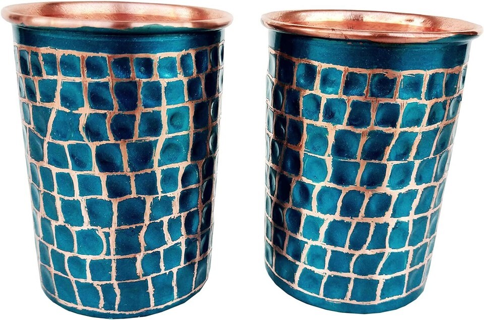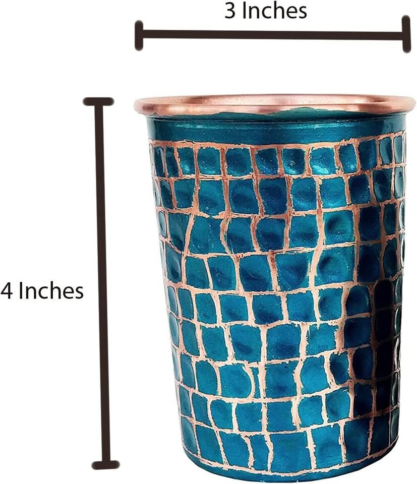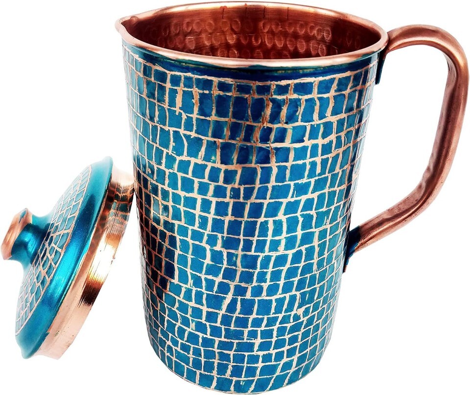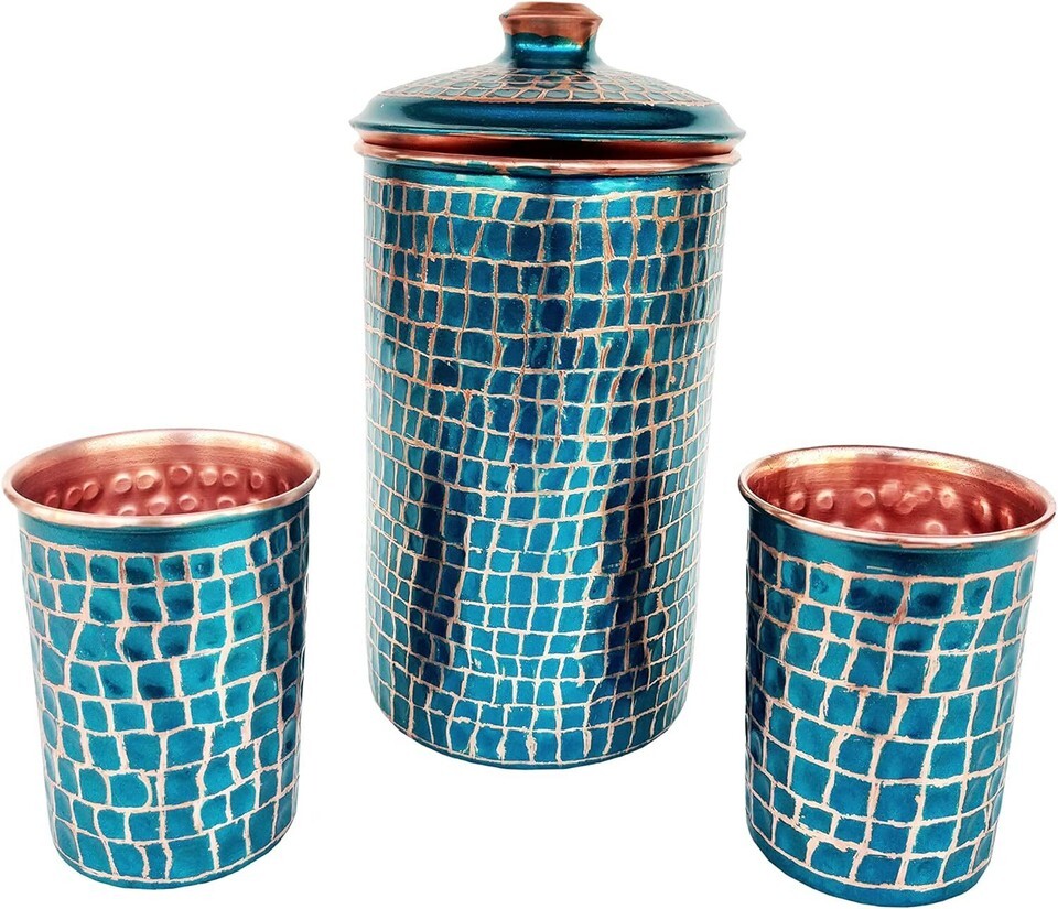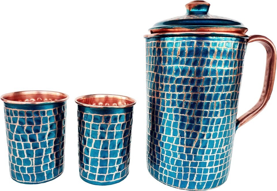 Pure Copper Jug - 2 Glass Outer Hammerd Firozi Paint Work Decorated Tumbler