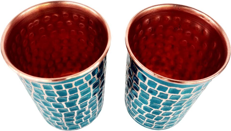 This product is a handmade water drinking set from India. The set includes a pure copper jug with hammered outer texture and firozi paint work decoration, along with two decorated tumblers. The set is lightweight and should be hand washed only. It is suitable for various occasions such as bachelor parties, anniversaries, casual gatherings, and holidays like Diwali and Eid al-Adha.
