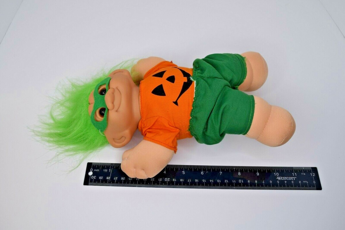 Vintage Cloud 9 Halloween Troll Plush Doll 11" Stuffed Toy w/ Plastic Head. Pre-owned in Good Condition. No rips or tears to the doll. The shirt and pants have some unravelling and other damage to them (see photos). Doll has wear from its age, use, and storage. See all photos for details and condition. Will ship USPS First Class Mail.
