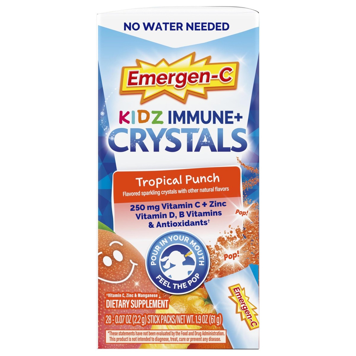 Expiration Date of 5/2026 ? Box of 28 stick packs of Emergen-C Kidz Immune Plus Crystals, On-the-Go Immune Support Supplement, Tropical Punch flavor ? 250mg Vitamin C and other antioxidants Zinc and Manganese, as well as Vitamin D and B vitamins for immune and energy support (1) ? No water needed; easy rip-and-pour directly into mouth for immediate use ? On-the-go packets fit in your pocket, bag or car so you always have them with you ? Crystals gently pop on your tongue ? Made from natural fruit flavors and natural sweeteners in a delicious Tropical Punch flavor ? Ages 4-8, take one stick per day. Ages 9-13 take up to two sticks per day