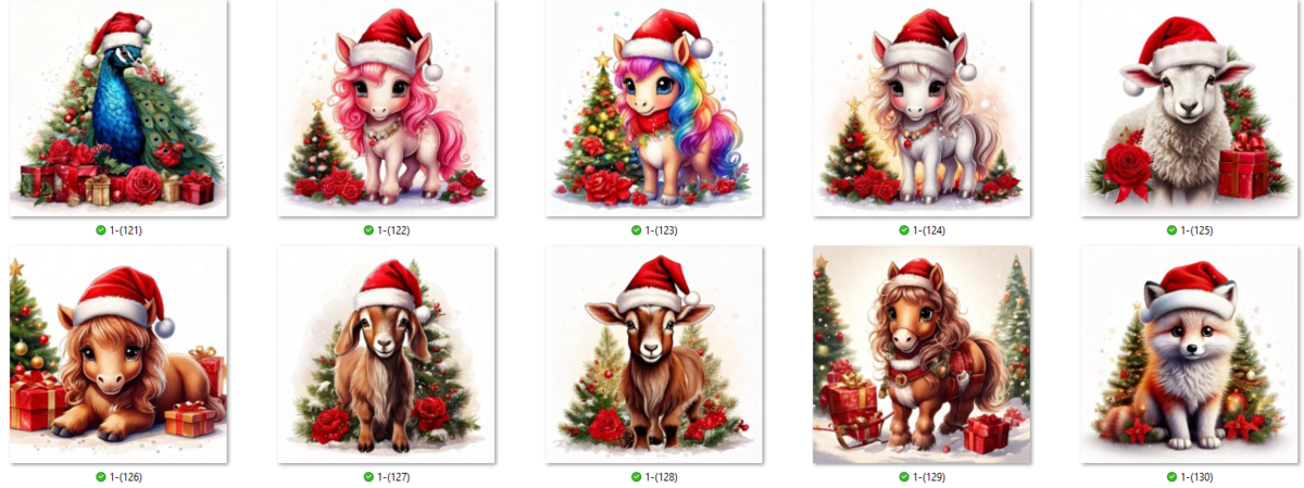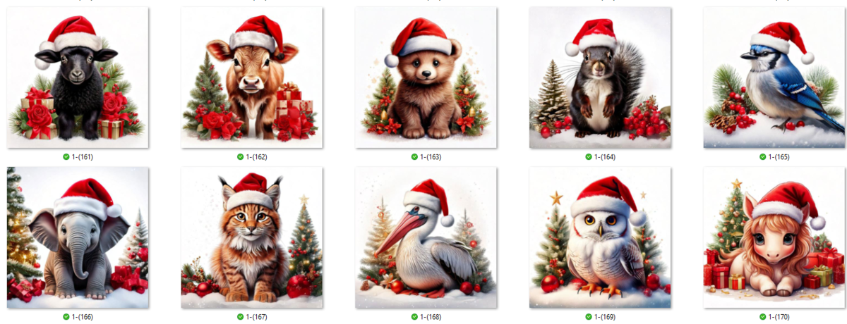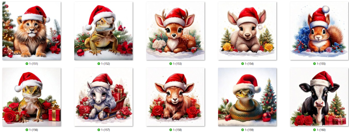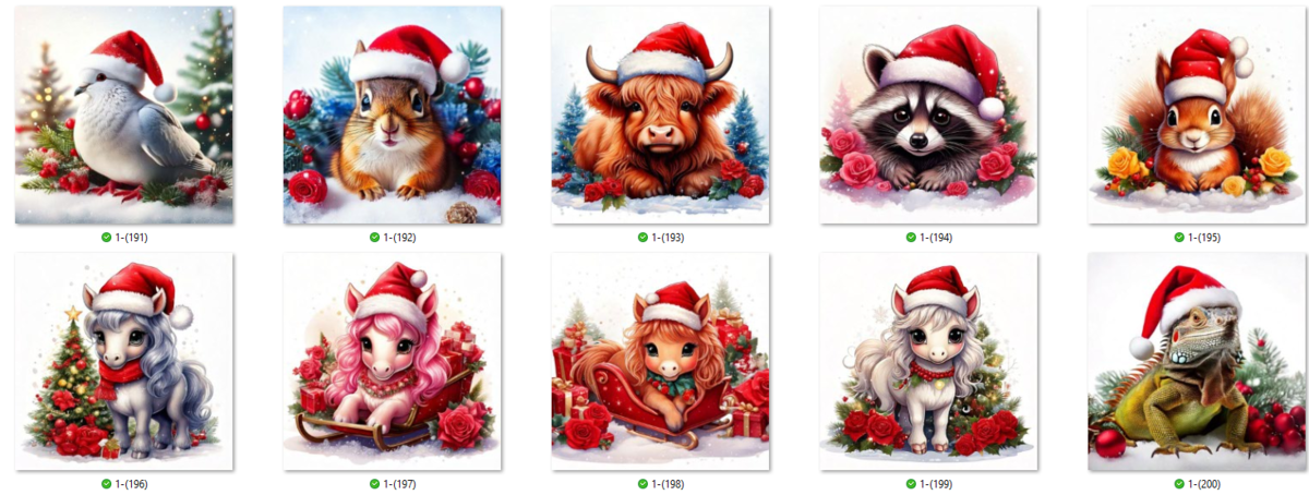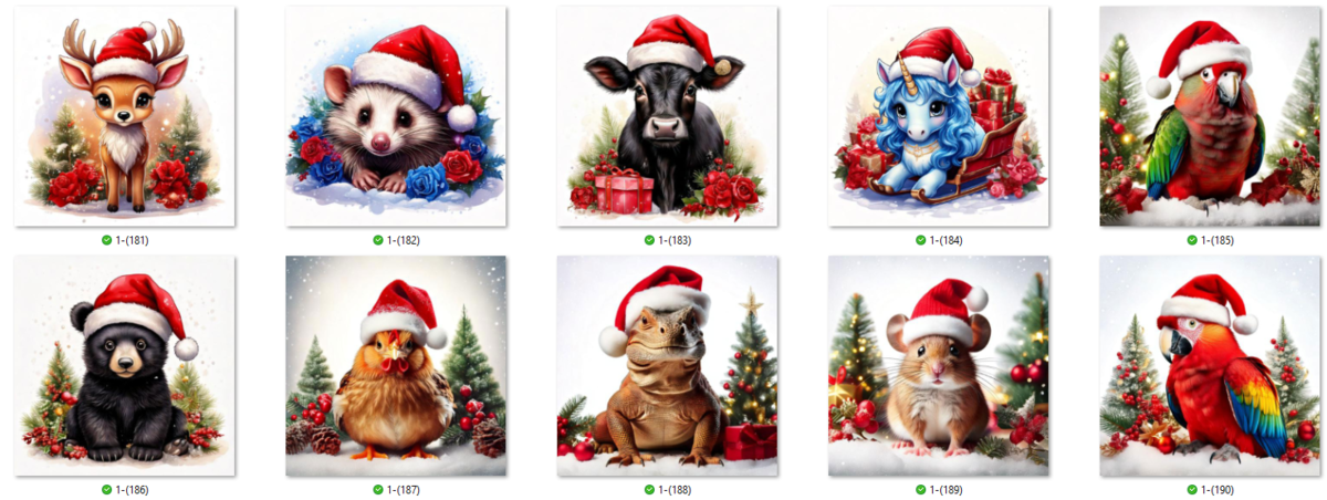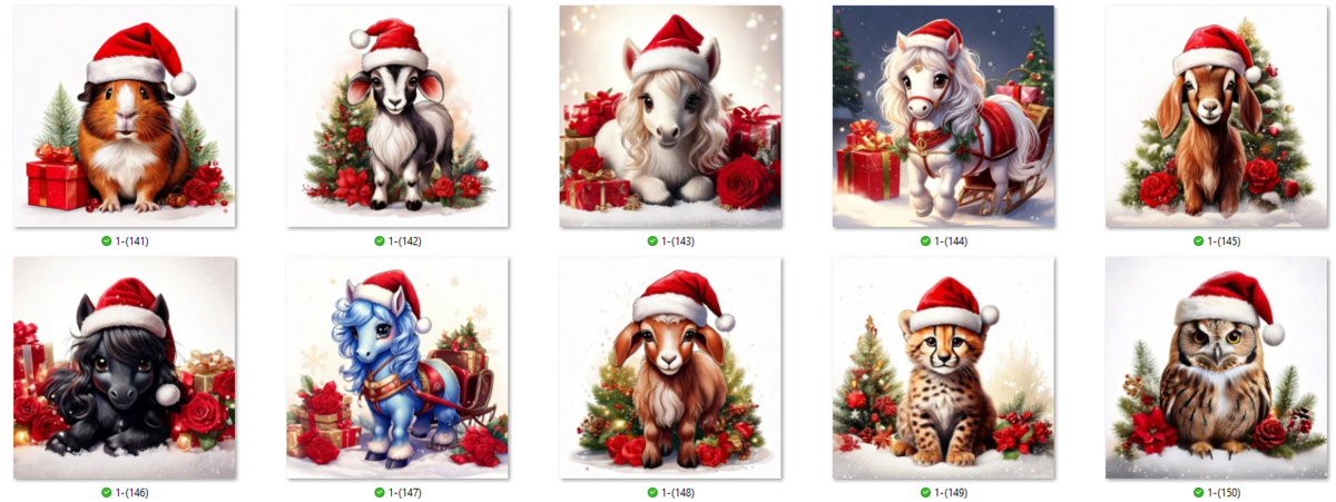 100 JPG Christmas Animal digital clip-art bundle. Beautiful animals such as Snow Owls, panthers, tigers, lions, leopards, cows, ponies and many more donning Santa hats.