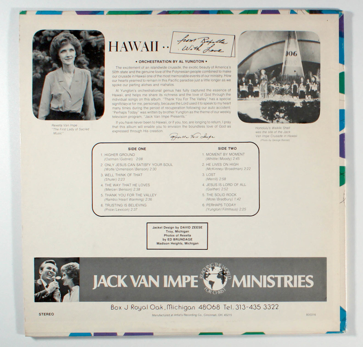 Hawaii... From Rexella With Love, by Rexella Van Impe, is a rare Christian easy-listening album featuring heartfelt renditions of inspirational hymns and gospel standards performed by the beloved co-host of the international television ministry Jack Van Impe Presents. Recorded in a lush, orchestral style, it showcases Rexella's warm alto voice delivering messages of faith through tracks like the uplifting opener Higher Ground and the reflective Only Jesus Can Satisfy Your Soul. Unique as one of the few solo musical endeavors by Rexella, who is primarily known for her evangelistic work alongside her husband Jack, the album stands out in religious music history for its serene, devotional approach blending sacred lyrics with soothing arrangements. Fan-favorites among collectors include the tender Thank You For The Valley and the triumphant closer Perhaps Today, which resonate deeply with Van Impe ministry devotees. This cherished obscurity continues to captivate exotica and gospel enthusiasts seeking wholesome tropical-flavored spirituality.