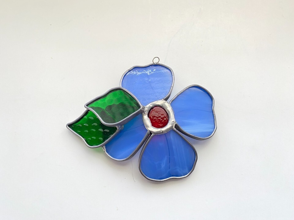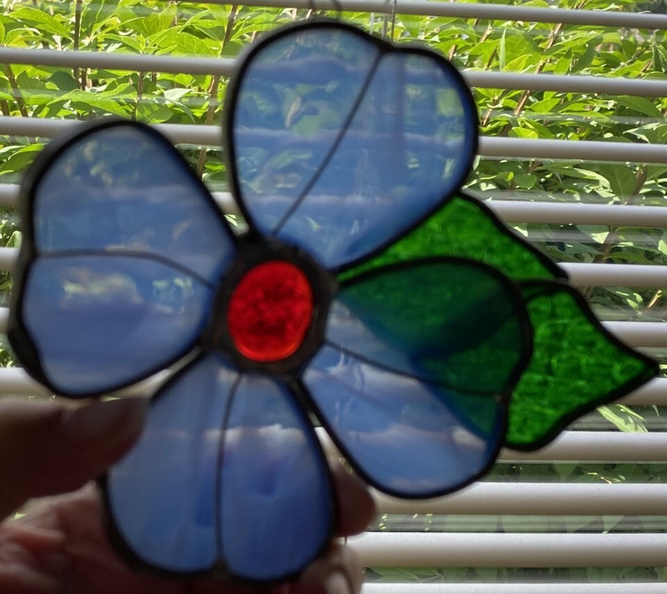 Vintage TIFFANY Stained Glass BLUE Flower Suncatcher. I think this is a dogwood flower. Originally would have had a Tiffany label which was removed.
